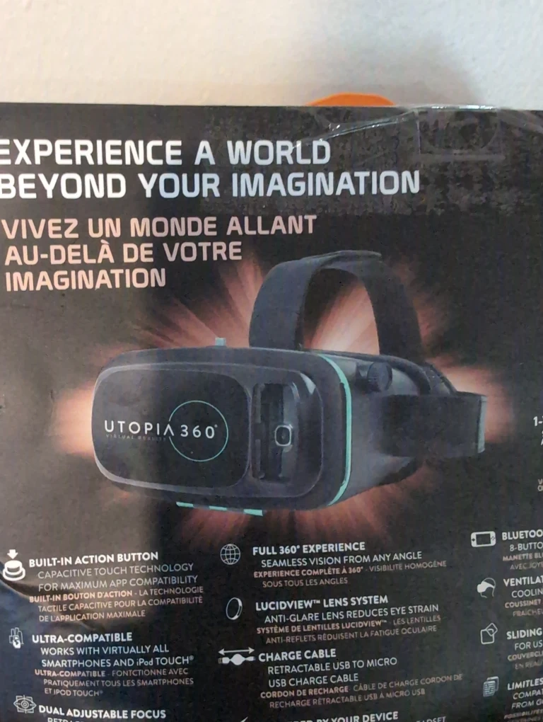 Selling a brand new Utopia 360° virtual reality headset, still in its original packaging! Experience a full 360° view with seamless vision from any angle. It features a LucidView lens system that reduces eye strain, and it's ultra-compatible with virtually all smartphones and iPod Touch. The headset also has a built-in action button for maximum app compatibility and a retractable USB to micro charge cable. Get ready for a world beyond your imagination!