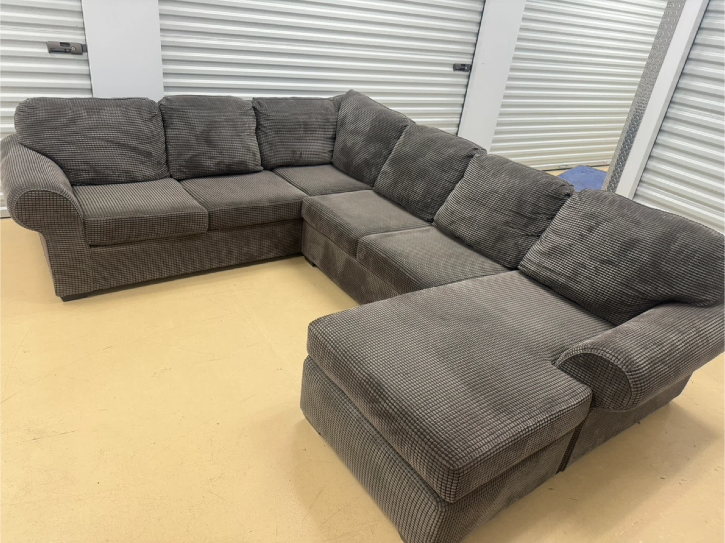 Selling a comfy grey sectional sofa! It features a chaise lounge, perfect for relaxing after a long day. The fabric has a nice texture and the cushions are soft. It's a great addition to any living room!good condition home delivery available