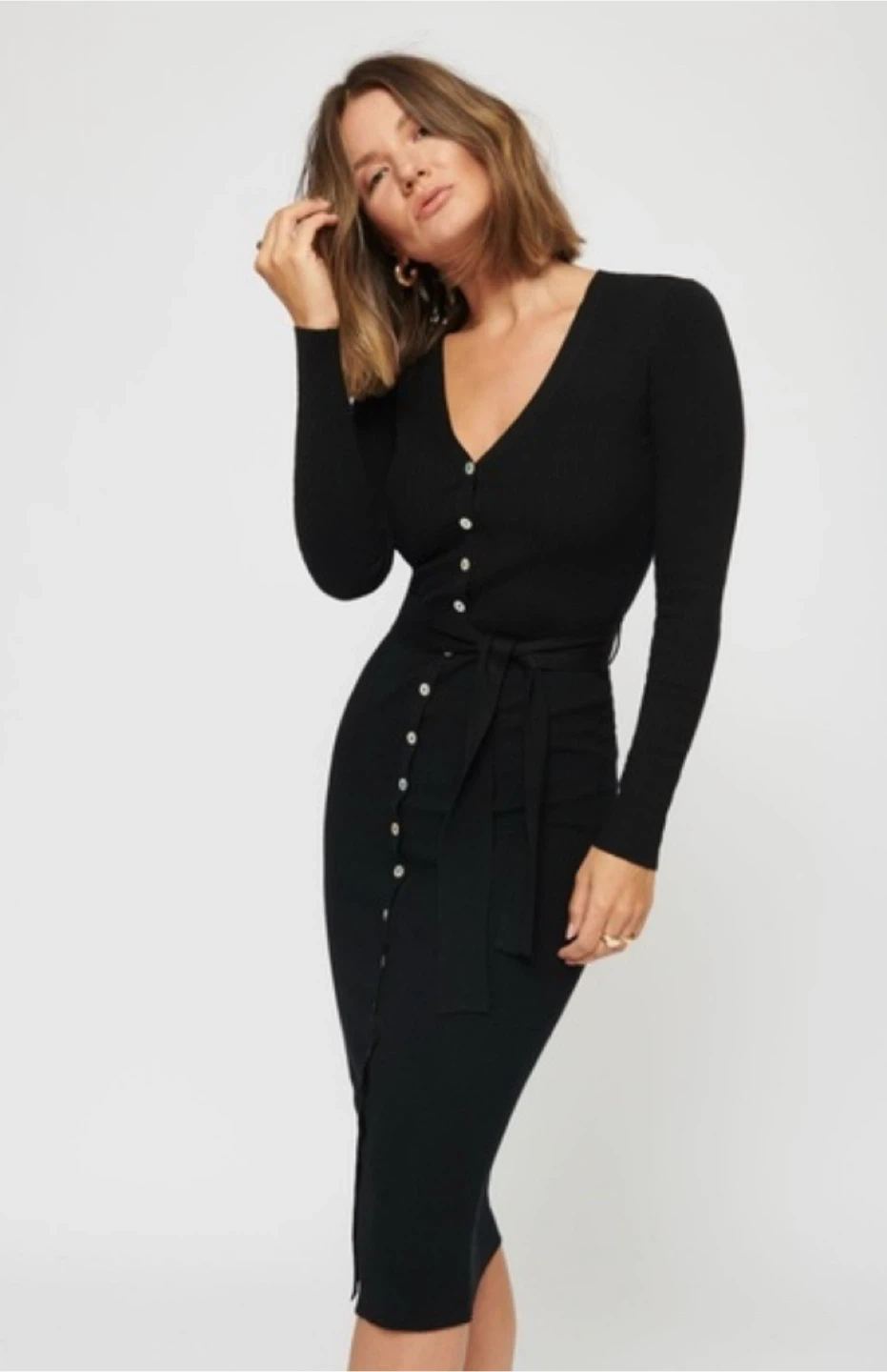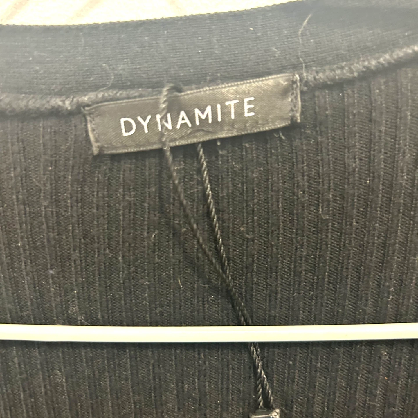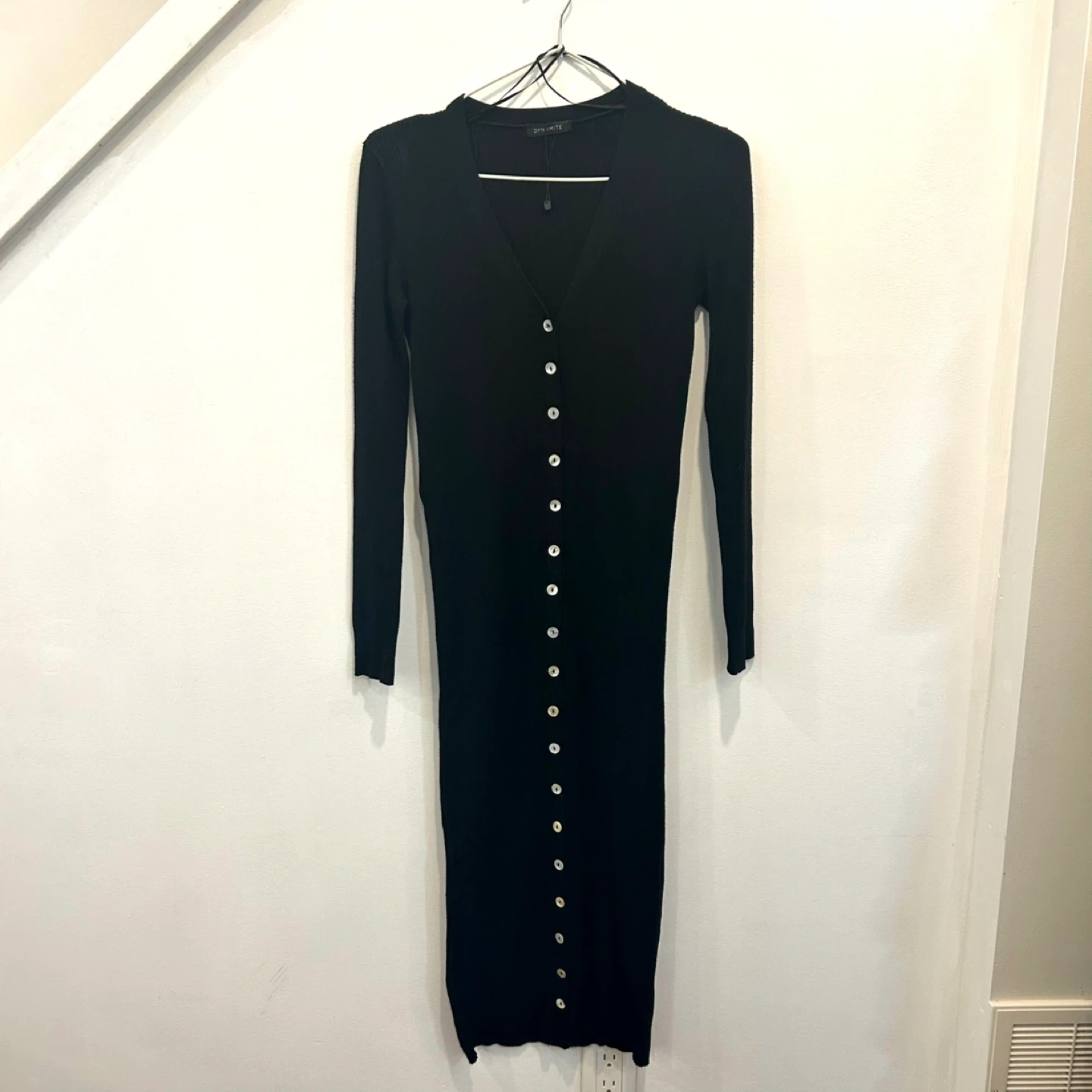 A cute black dress from Dynamite in size XS. It's a button-up style and made of 80% viscose and 20% nylon