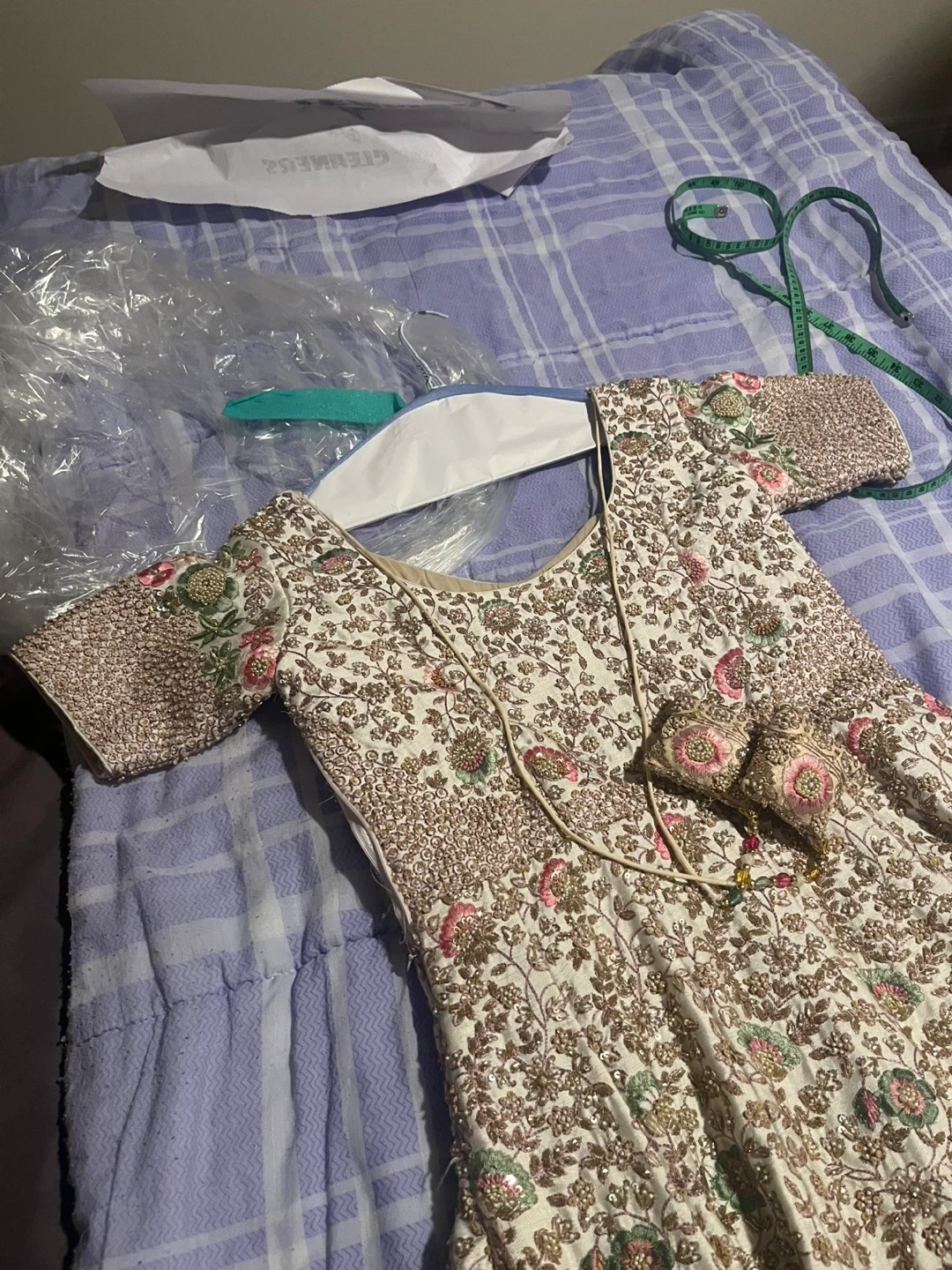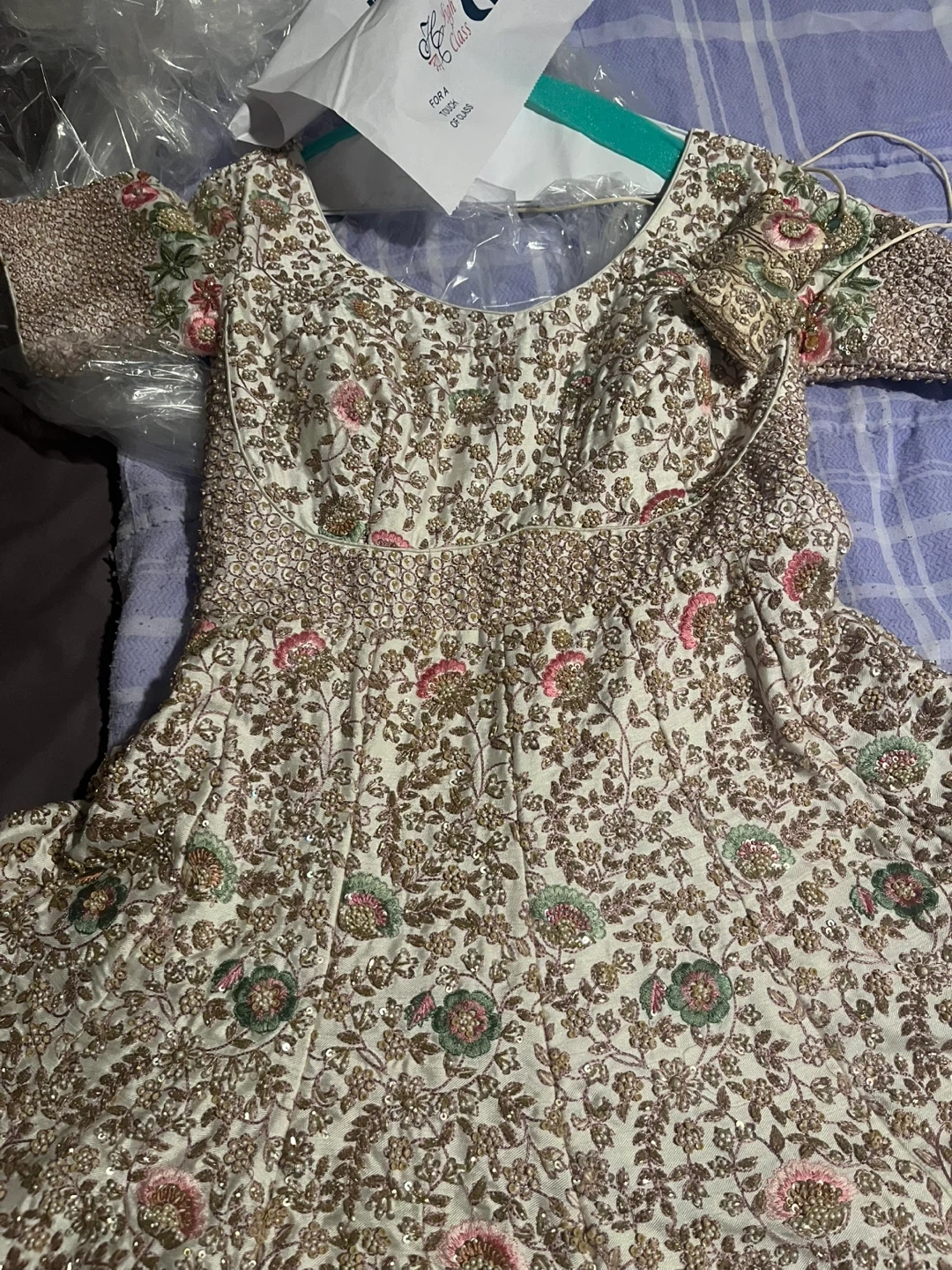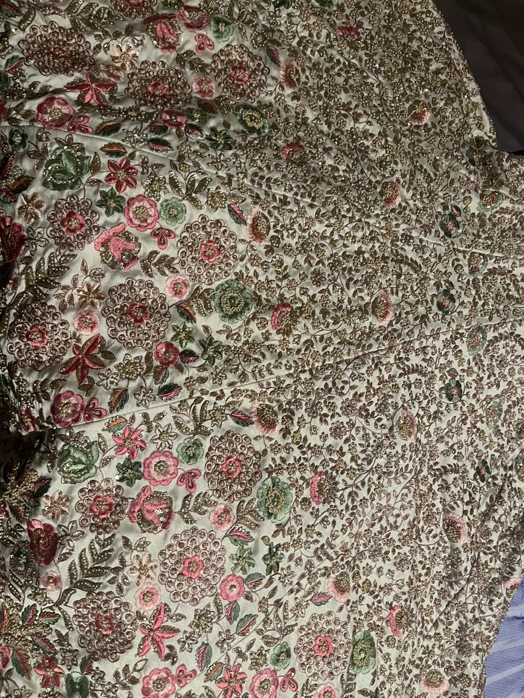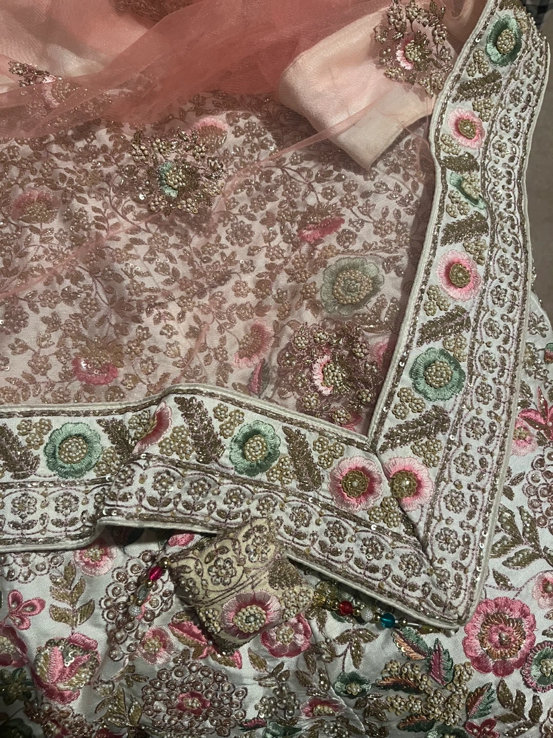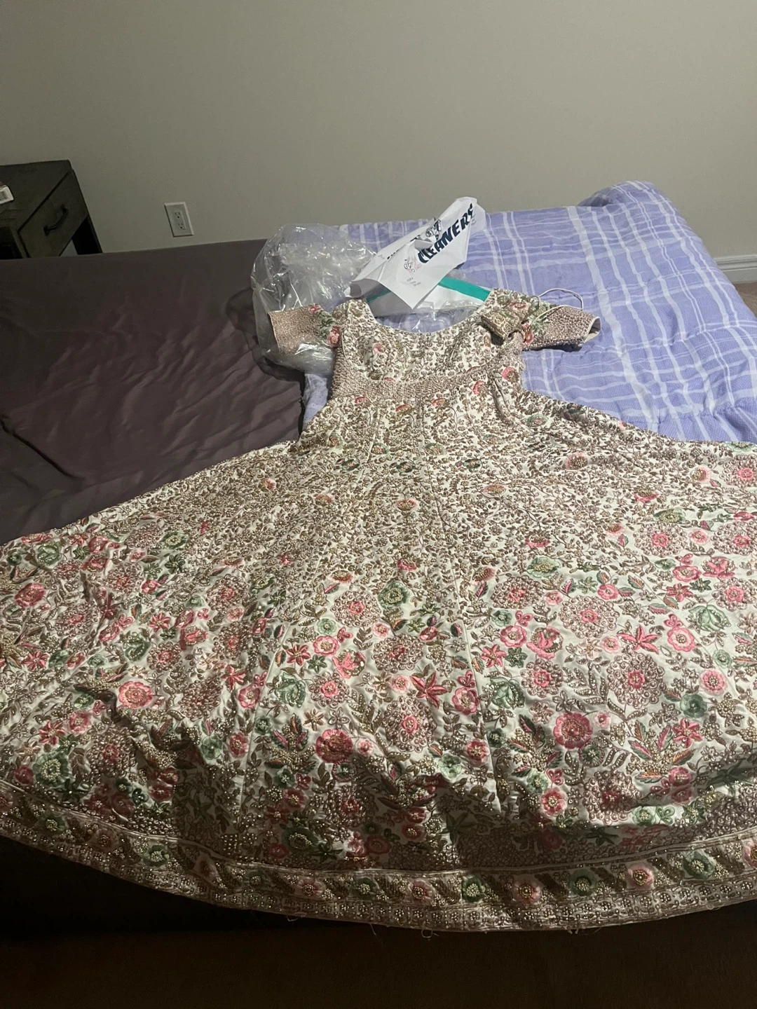 Beautiful lehenga dress with intricate floral embroidery. The dress features detailed beadwork and embroidery throughout. Perfect for a special occasion or celebration! lengha measurements flare - 90inch length (top to bottom) - 54inch shoulder - 14inch bust - 17inch waist - 15inch neck - 7.5inch sleeve length - 8inch sleeve armhole - 5inch zipper left side net dupatta with border new, not worn one piece, can be separated and altered suitable for heights 5"1-5"5