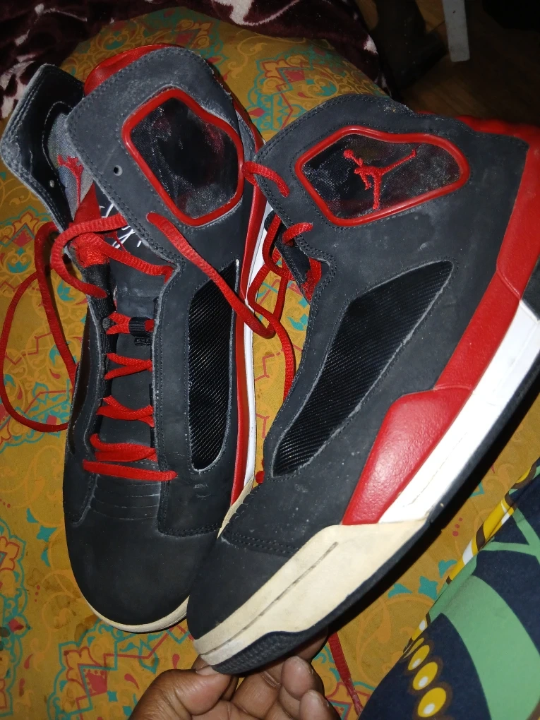 Selling a pair of Air Jordan Flight 45 High sneakers in size 11.5 US. They feature a black and red colourway with the iconic Jumpman logo. These high-tops are in good condition and ready for a new home!