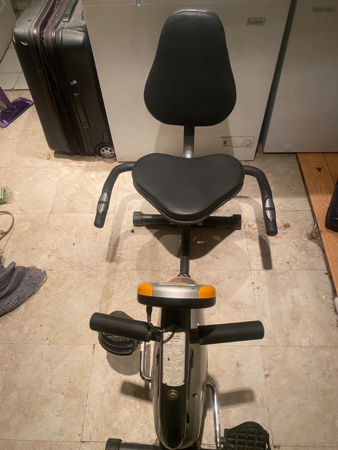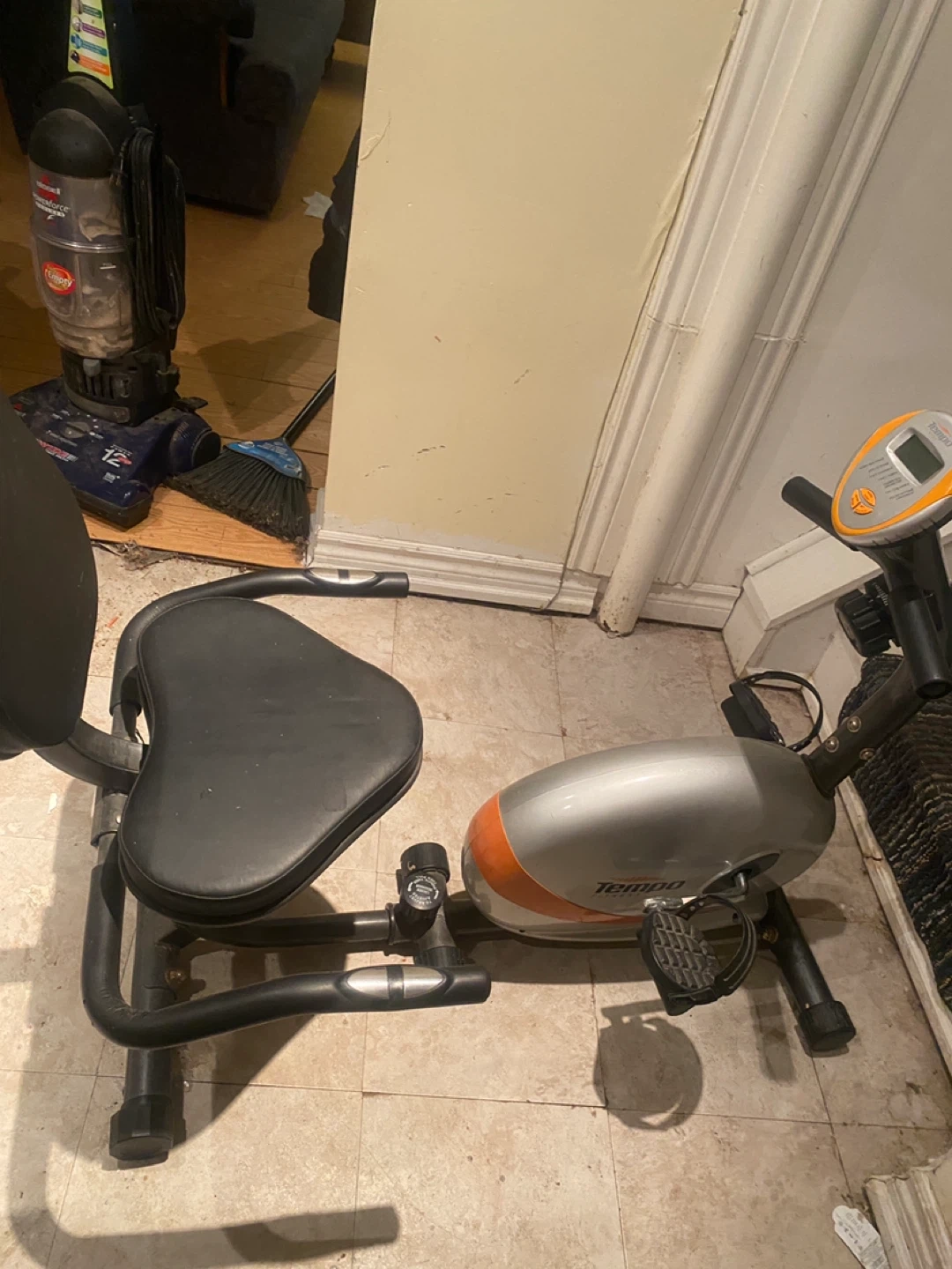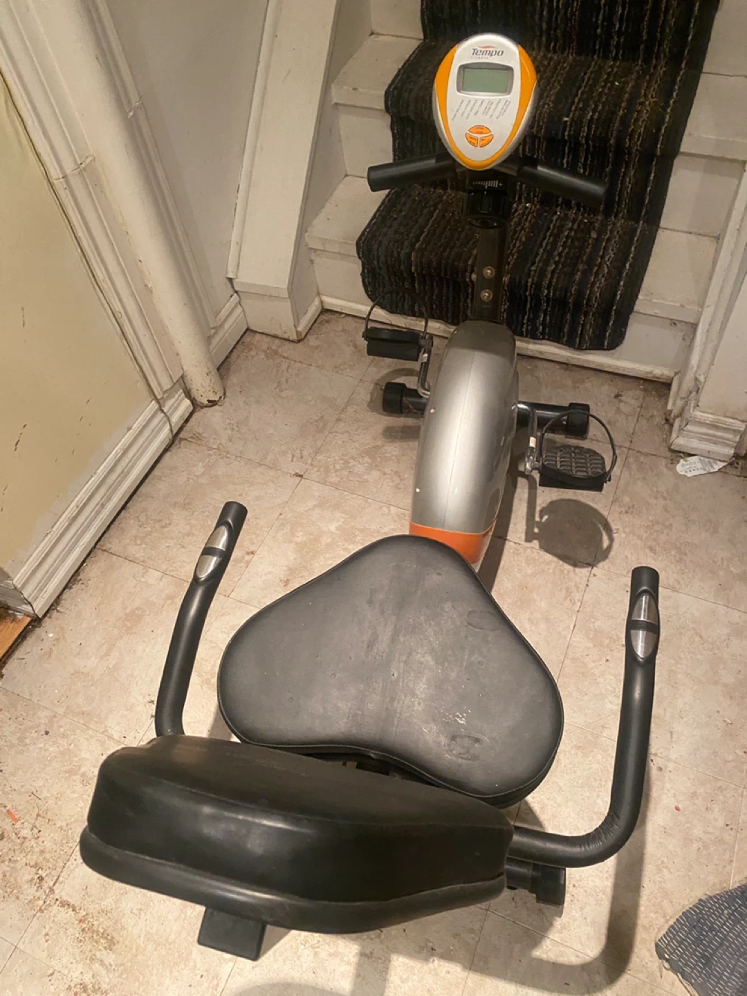 Get fit with this Tempo Fitness exercise bike, perfect for home workouts! This stationary bike is in used condition but is still ready to help you achieve your fitness goals, tracking speed, distance and calories burned.
