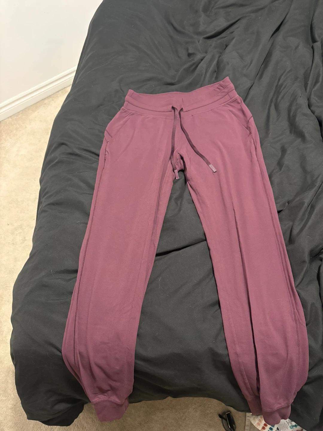 Selling a pair of Lululemon jogger pants in a lovely burgundy colour. They are a size 6 and in great condition! Perfect for lounging or working out
