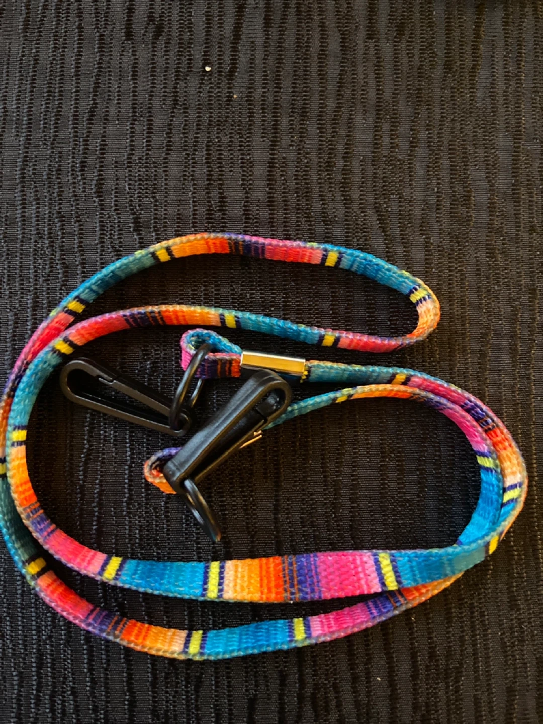 Here's a fun and colourful lanyard! It features a vibrant striped design with a sturdy black clip. Perfect for holding keys, ID badges, or anything else you need to keep handy