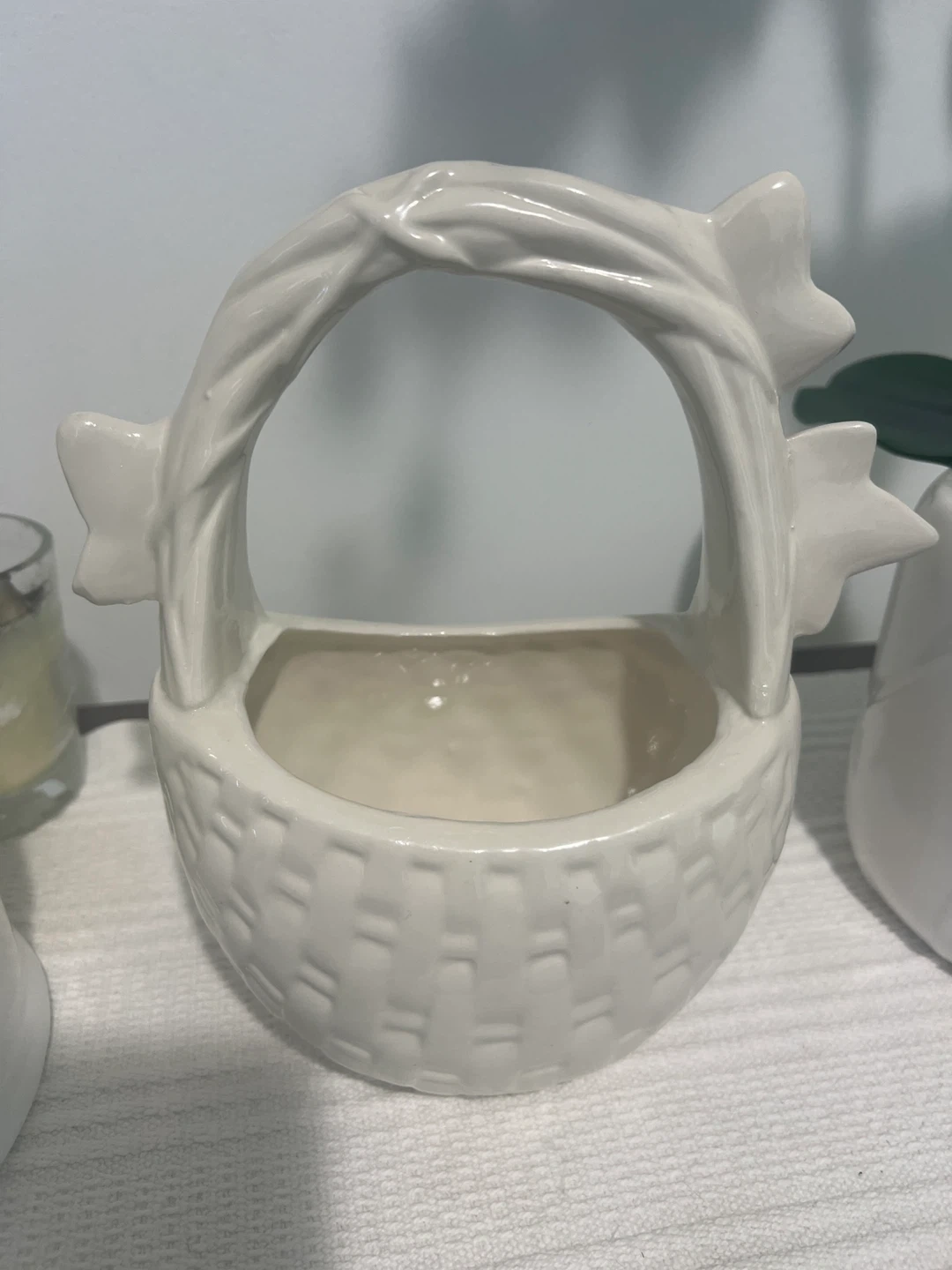 Selling a cute white ceramic basket! It's in great condition and would be perfect for storing small items or using as a decorative piece in your home
