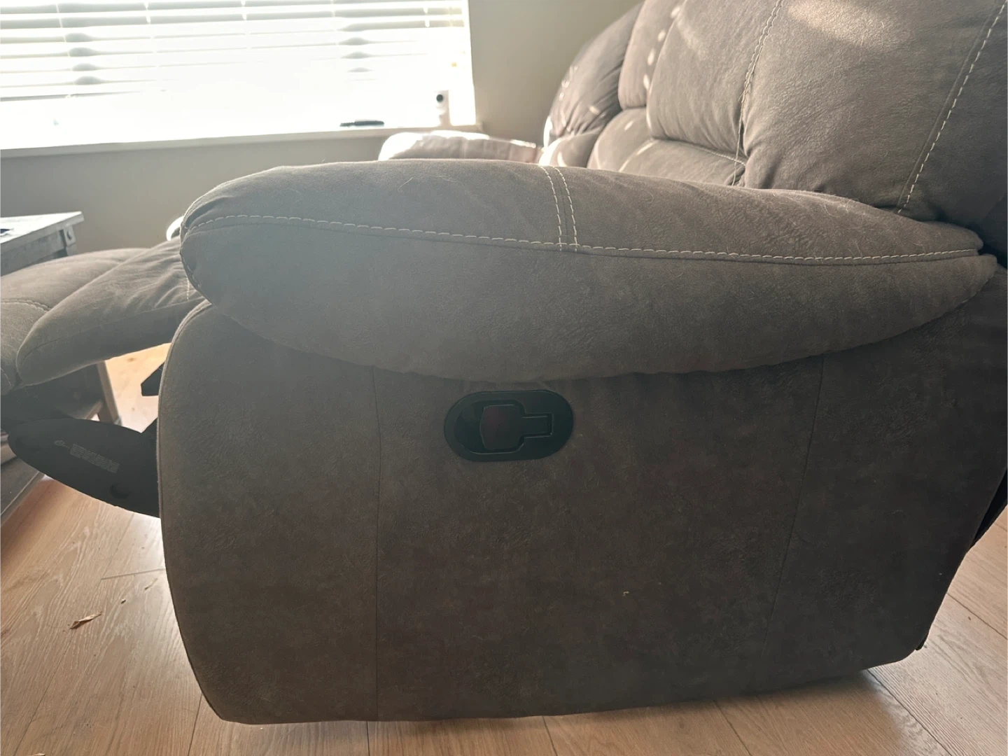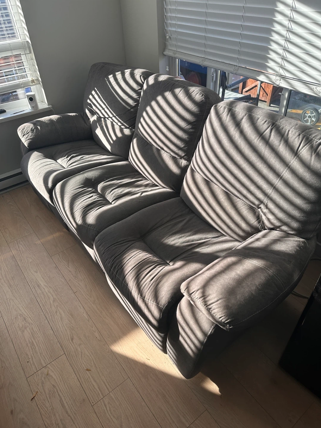 Selling a comfortable grey reclining sofa. It's in great condition and perfect for relaxing after a long day. The recliner function works smoothly on both seats, making it ideal for movie nights or just lounging around. Both ends recline. Non smoking house but there is a dog in the house.