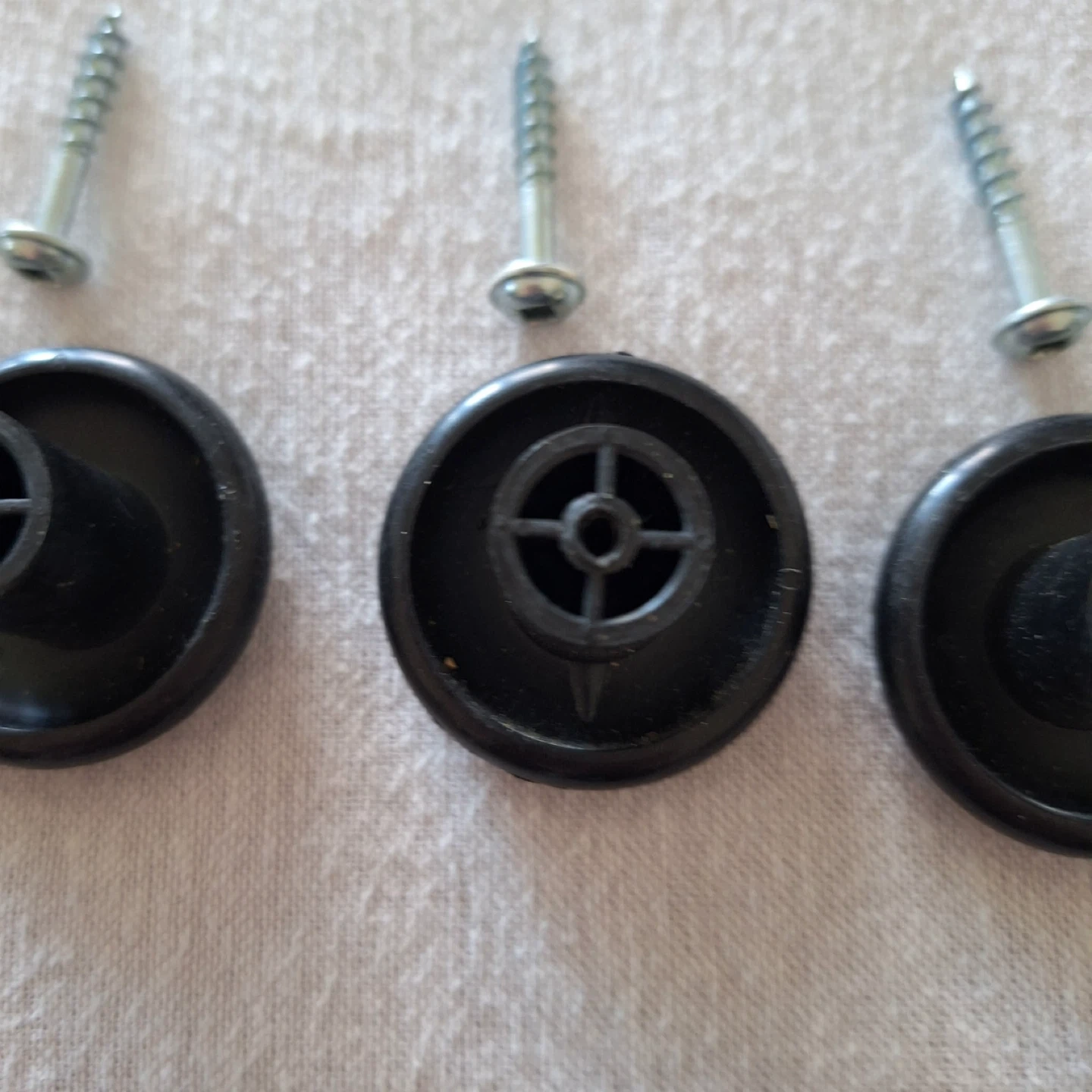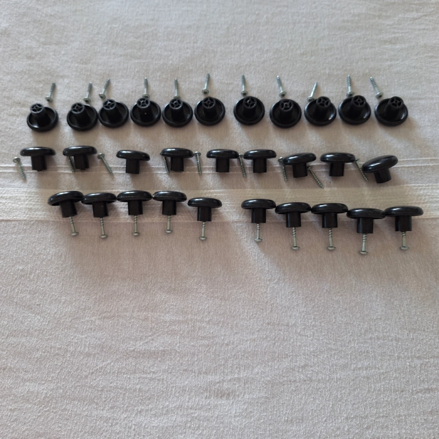 Selling a set of 30 black knobs, perfect for drawers or cabinets! They come with the screws for easy installation. Great for updating your furniture or adding a cohesive look to your space. Black plastic and in perfect condition. No scratches never touched