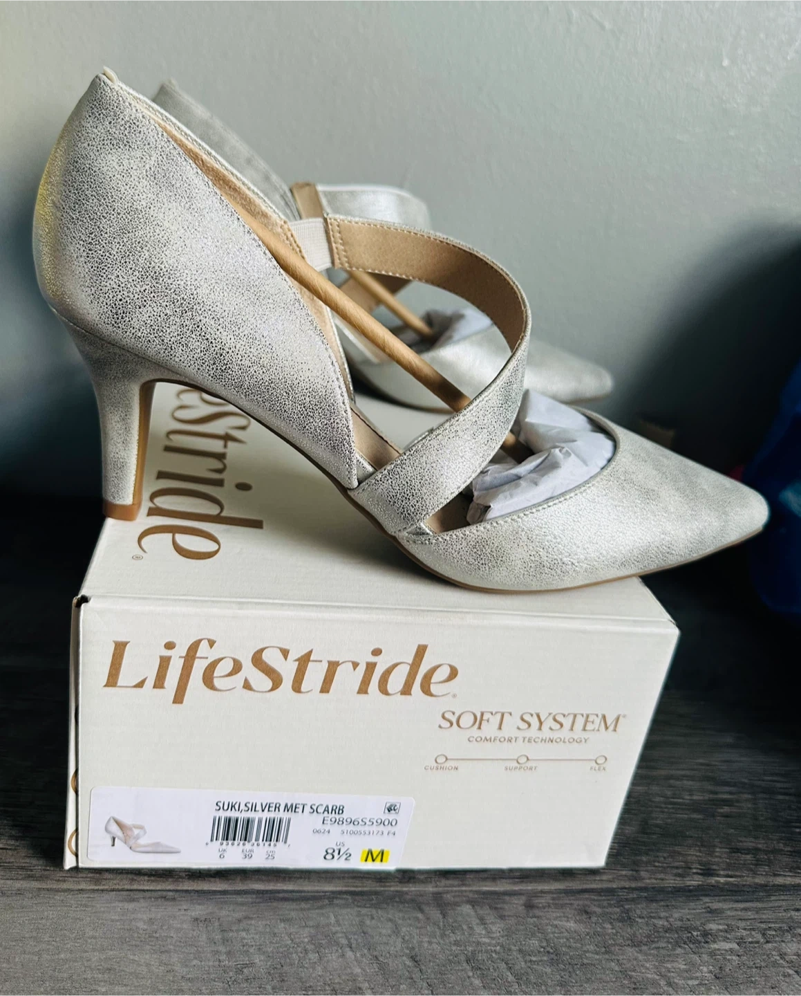 Selling a brand new pair of LifeStride Suki heels in silver! They're a size 8.5M and come with the original box. These heels feature the Soft System comfort technology, so you can look good and feel good. Perfect for a night out or a special occasion!