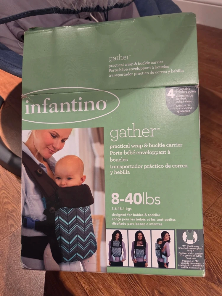Selling an Infantino Gather practical wrap & buckle carrier! It's designed for babies and toddlers, supporting weights from 8-40lbs (3.6-18.1 kgs). The box mentions it has 4 adjustable comfort points. Perfect for keeping your little one close and secure!