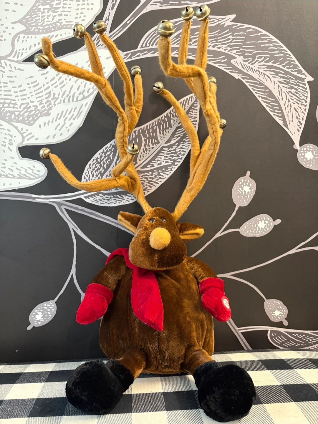 A cute reindeer plush with bells on its antlers dances to “Jingle Bell Rock”! It's wearing a red scarf and mittens, perfect for the holidays. Requires AA x3 batteries.