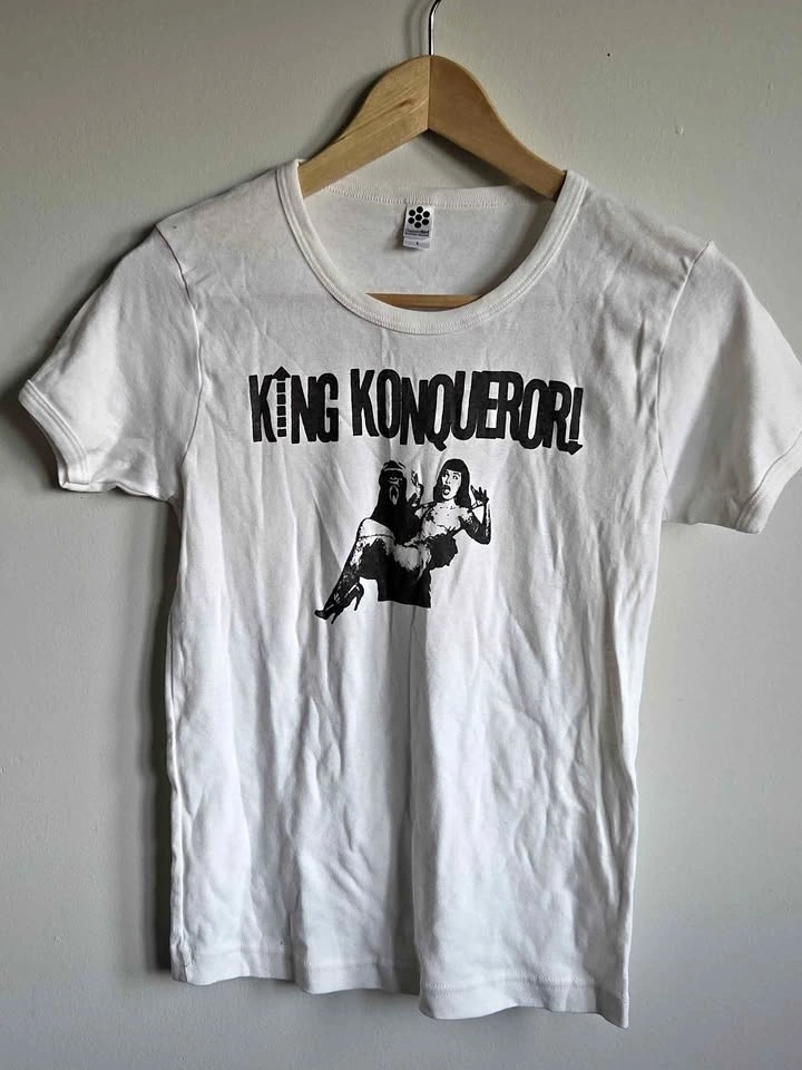 This is an original band merch tee from the early days of the band, featuring the bold "KING KONQUEROR!" logo and a classic King Kong/Pinup girl graphic. Perfect for music collectors, ska fans, or anyone who appreciates a unique vintage graphic tee!