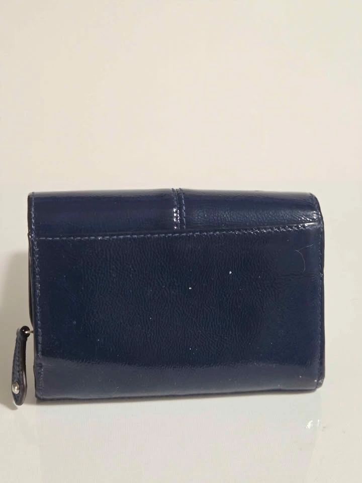 Authentic Coach trifold wallet from the popular Ashley line, in a vibrant cobalt blue glossy patent leather. While the shade is rich and deep, it can also be described as navy blue or midnight blue—it is a truly stunning, eye-catching colour!