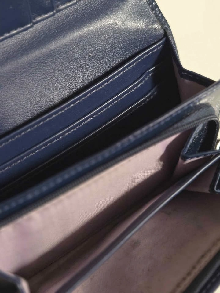 Interior: Multiple card slots, cash compartments, and a zippered coin pocket.