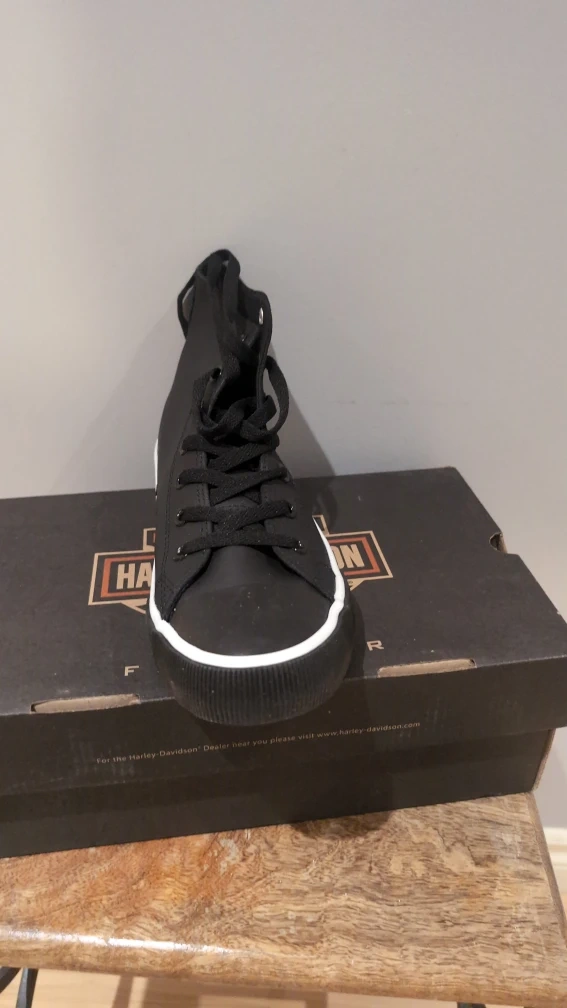 Selling a pair of Harley-Davidson Baxter high-top sneakers in size 9.5. They are black and white and come with the original box! Never worn.