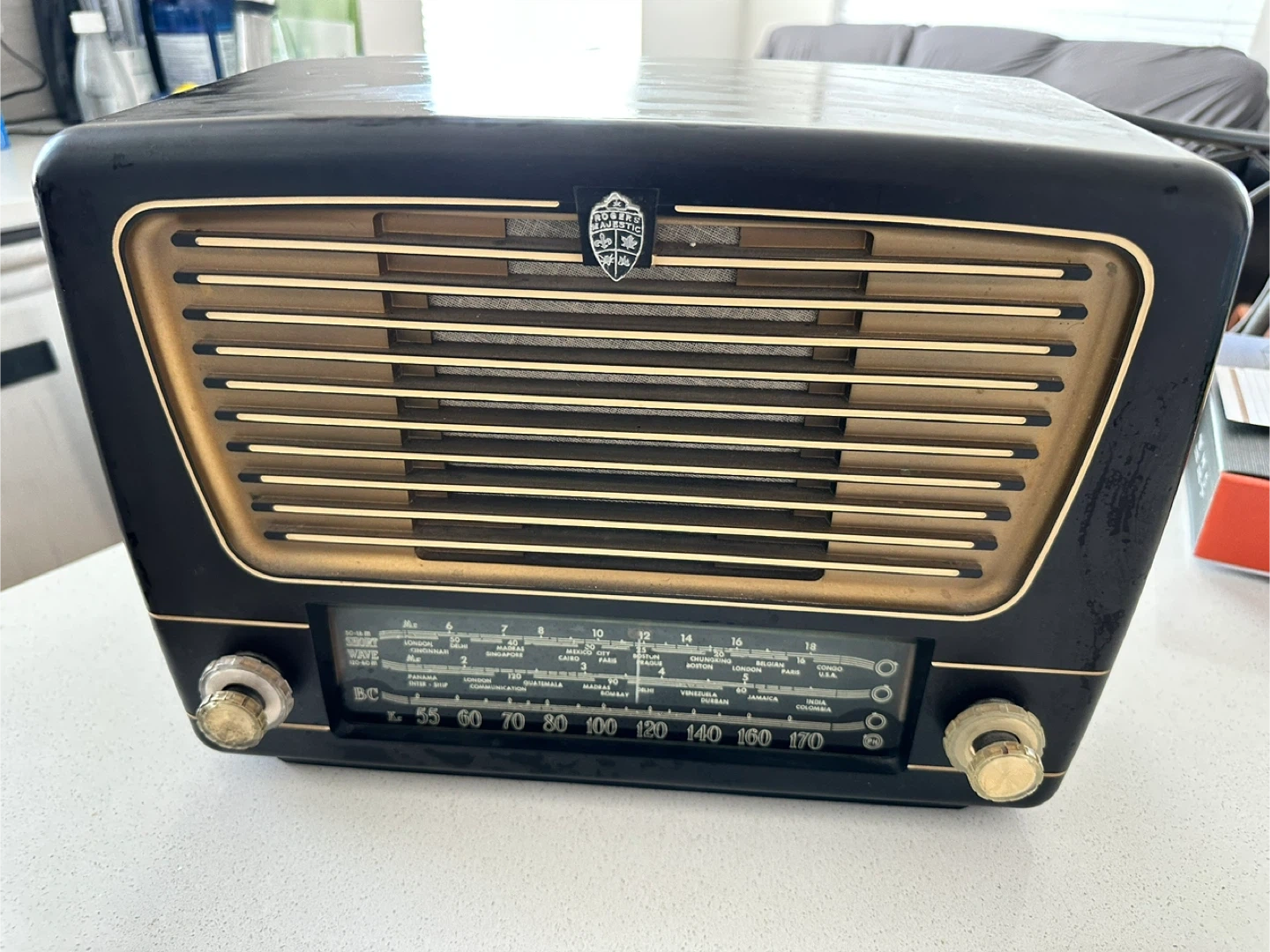 Selling a vintage Rogers Majestic radio, model number R555. It was distributed by Rogers Majestic Radio Corp. Ltd. in Toronto, Montreal. The model was patented between 1940-1956. It operates at 117 Volts AC/DC with 0.32 Amps. There is some damage to it from being dropped 40 years ago. Still a great display piece!