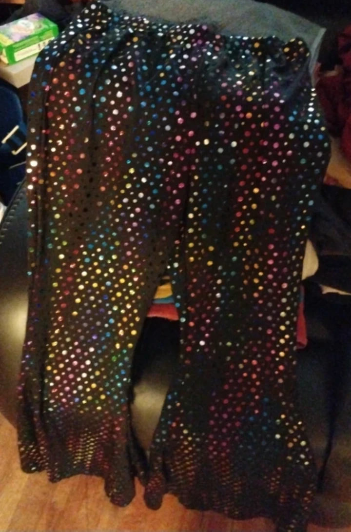 These are pants with a black background and colorful polka dots all over them. They are in good condition and ready for a new home!