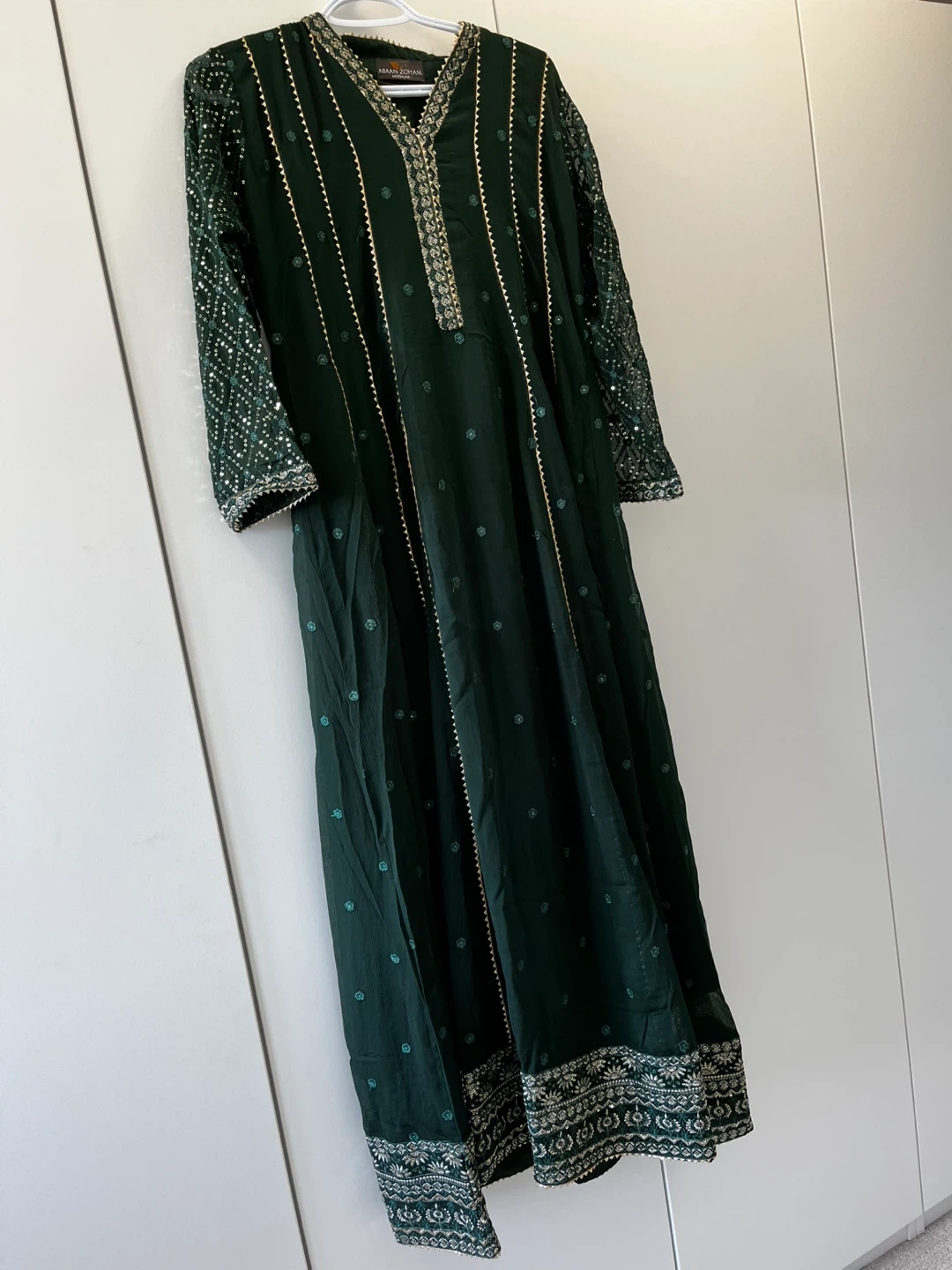 Beautiful dark green Pakistani/indian Anarkali salwar kameez. It features intricate embroidery and detailing. Perfect for special occasions or cultural events!
