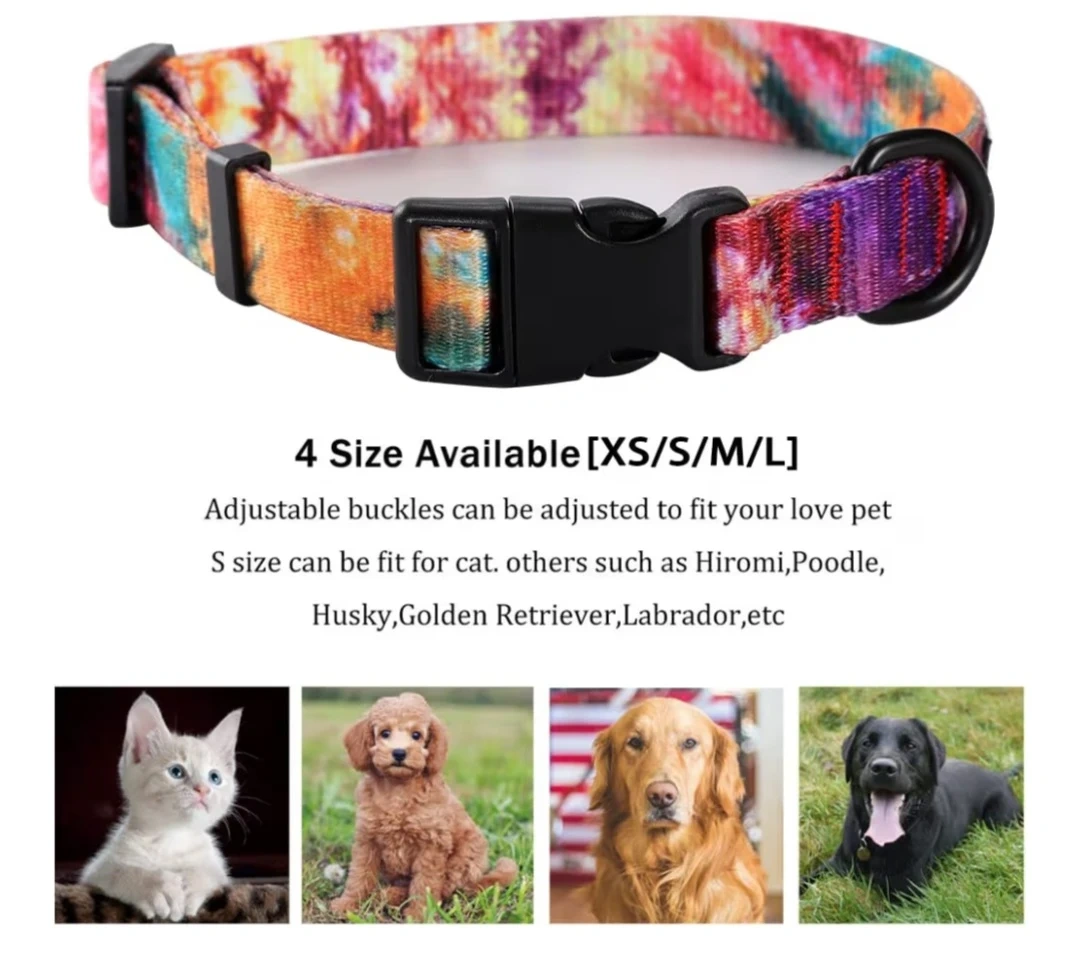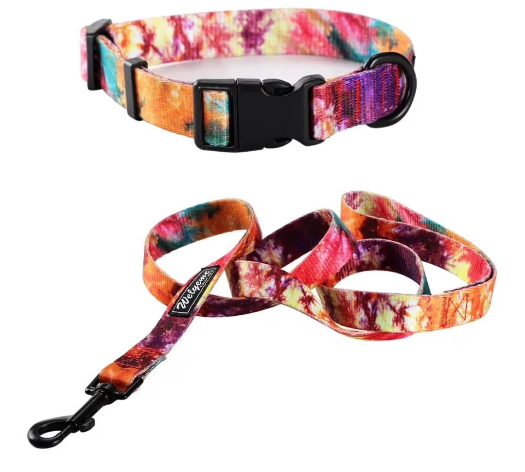 This Wolyone dog leash and collar set features a fun tie-dye pattern! The collar is size XS, adjustable. The leash has a sturdy buckle and 360-degree snap hooks for secure walks