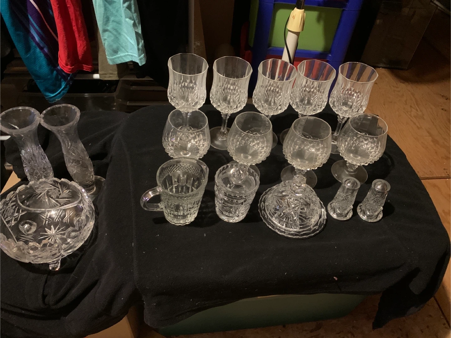 Crystal glassware set for 4 including 2 candle holders glass bowl salt and pepper shakers butter dish sugar dish and milk dish. 4 short stem glasses and 5 tall. Asking 125 OBO