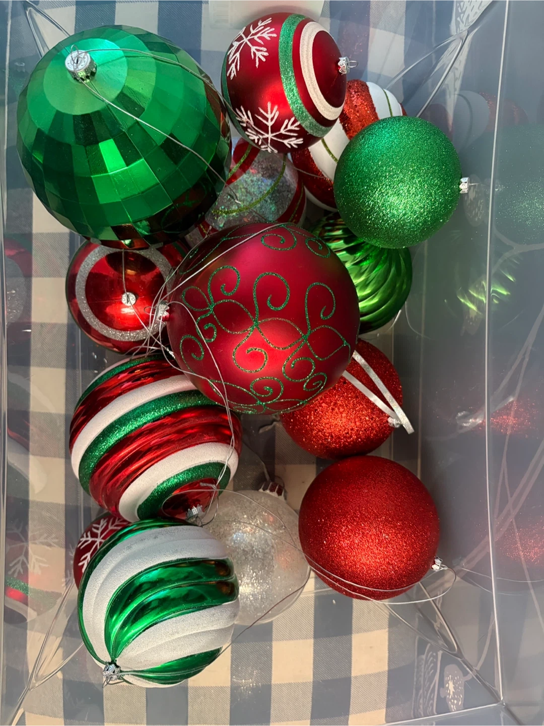 Selling a collection of 15 oversized plastic Christmas ornaments in red, green, and white. From 4-6” in diameter. They're perfect for adding a festive touch to your holiday season!