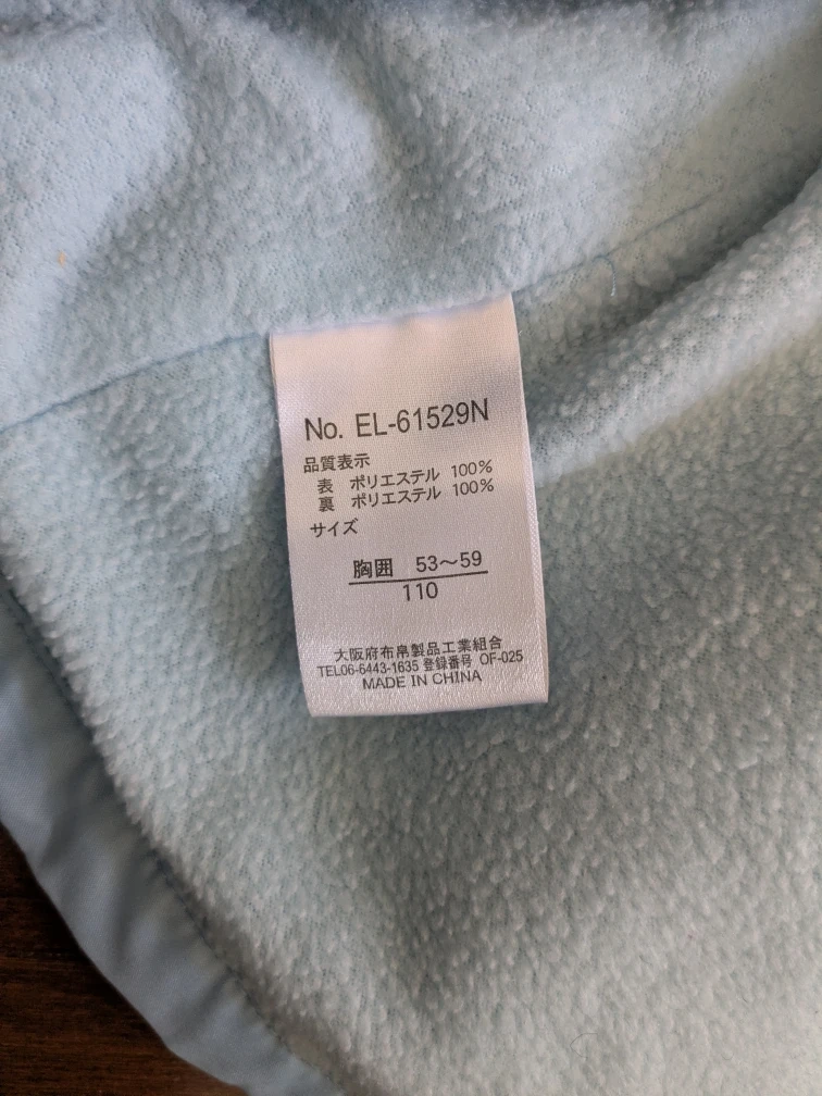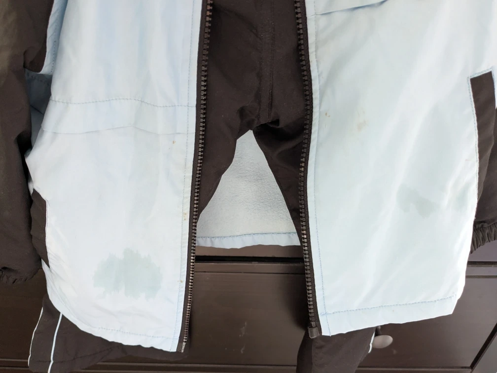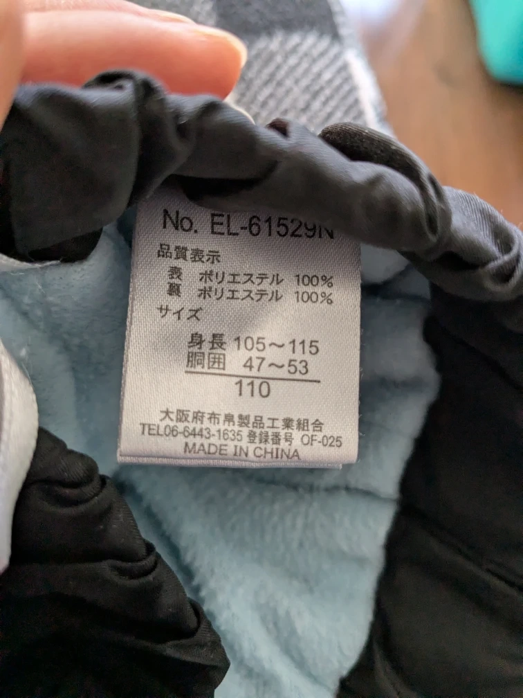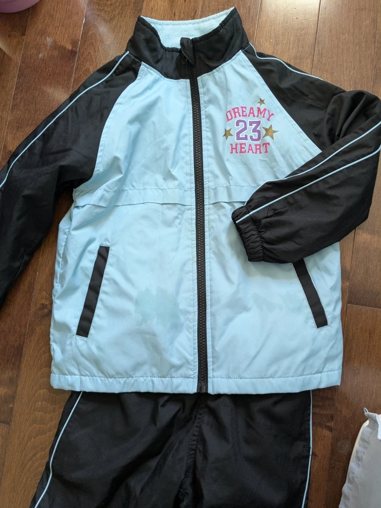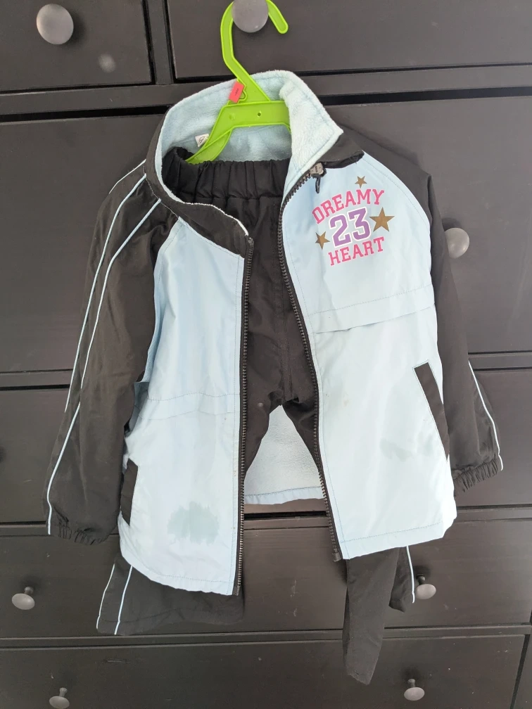 Selling a cute jacket and pants set for kids! The tag indicates it's size 110, suitable for a height of 105-115cm and chest circumference of 47-53cm. The jacket is light blue and black with a "Dreamy Heart" design. There are some stains on the front of the jacket, but otherwise it's in good condition