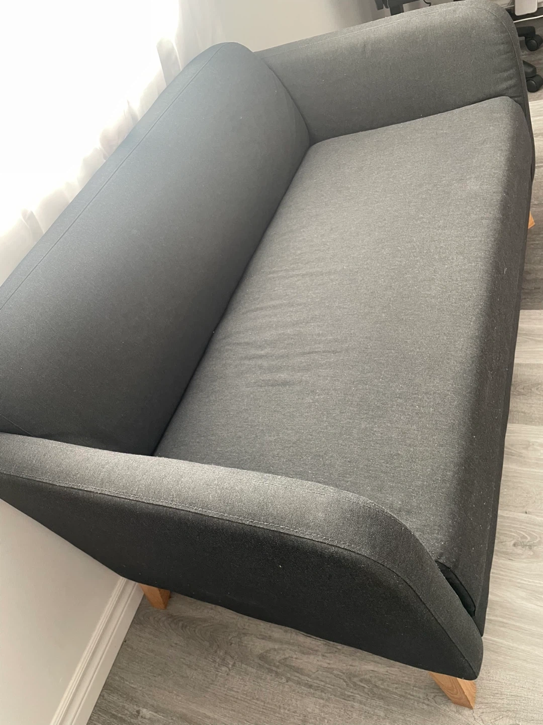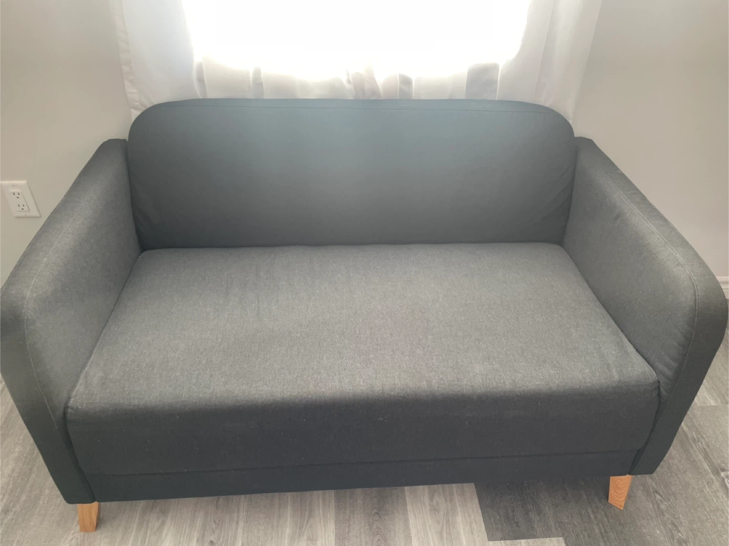 Selling a comfy grey loveseat sofa. It's in great shape and perfect for a small space or apartment. It has a simple design that will fit in with any decor