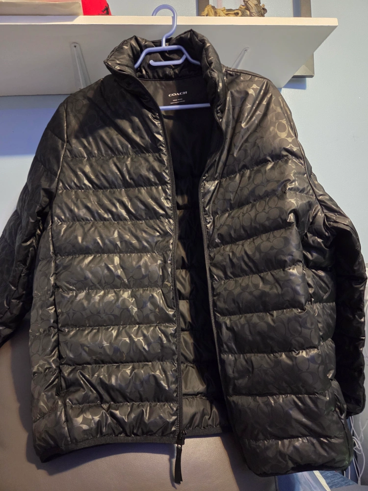 Selling a Coach black puffer jacket in size medium. It's made with 100% polyester for both the shell and lining, and filled with 90% grey duck down and 10% grey duck feathers. It's in great condition and ready for a new home!