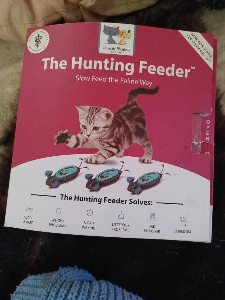 I'm selling a Doc & Phoebe's The Hunting Feeder. It's designed to slow feed your feline friend in a fun and engaging way! The box says it helps with weight problems, night waking, litterbox problems, bad behaviour, and boredom. It's also non adjustable for every age cat