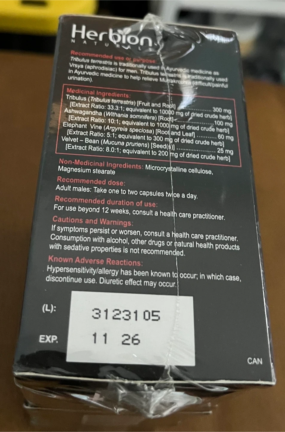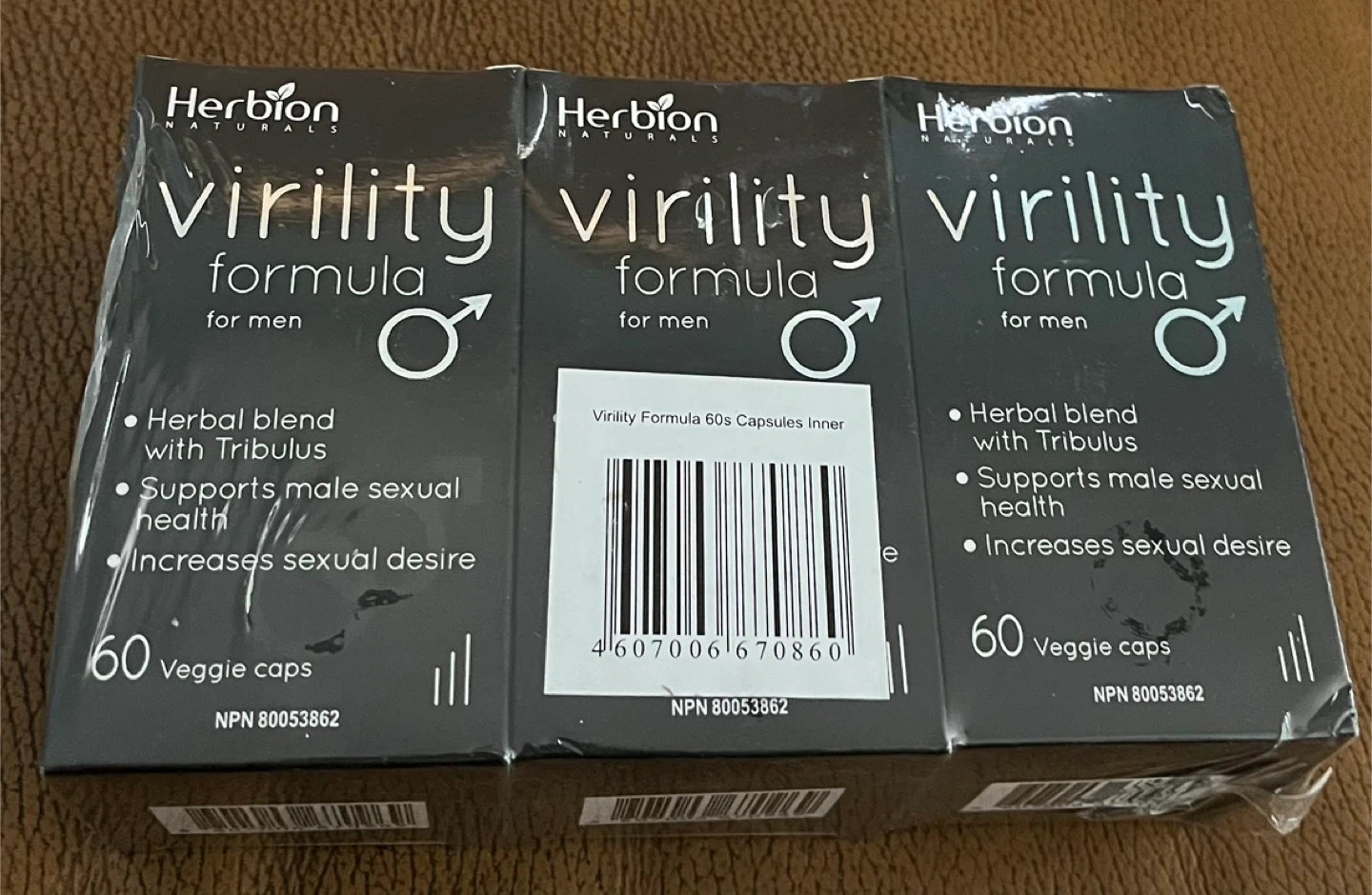 Selling a new, sealed box of Herbion Naturals Virility Formula for Men! This contains 60 veggie caps. It's an herbal blend with Tribulus, supports male sexual health, and increases sexual desire. Expiry date is November 2026