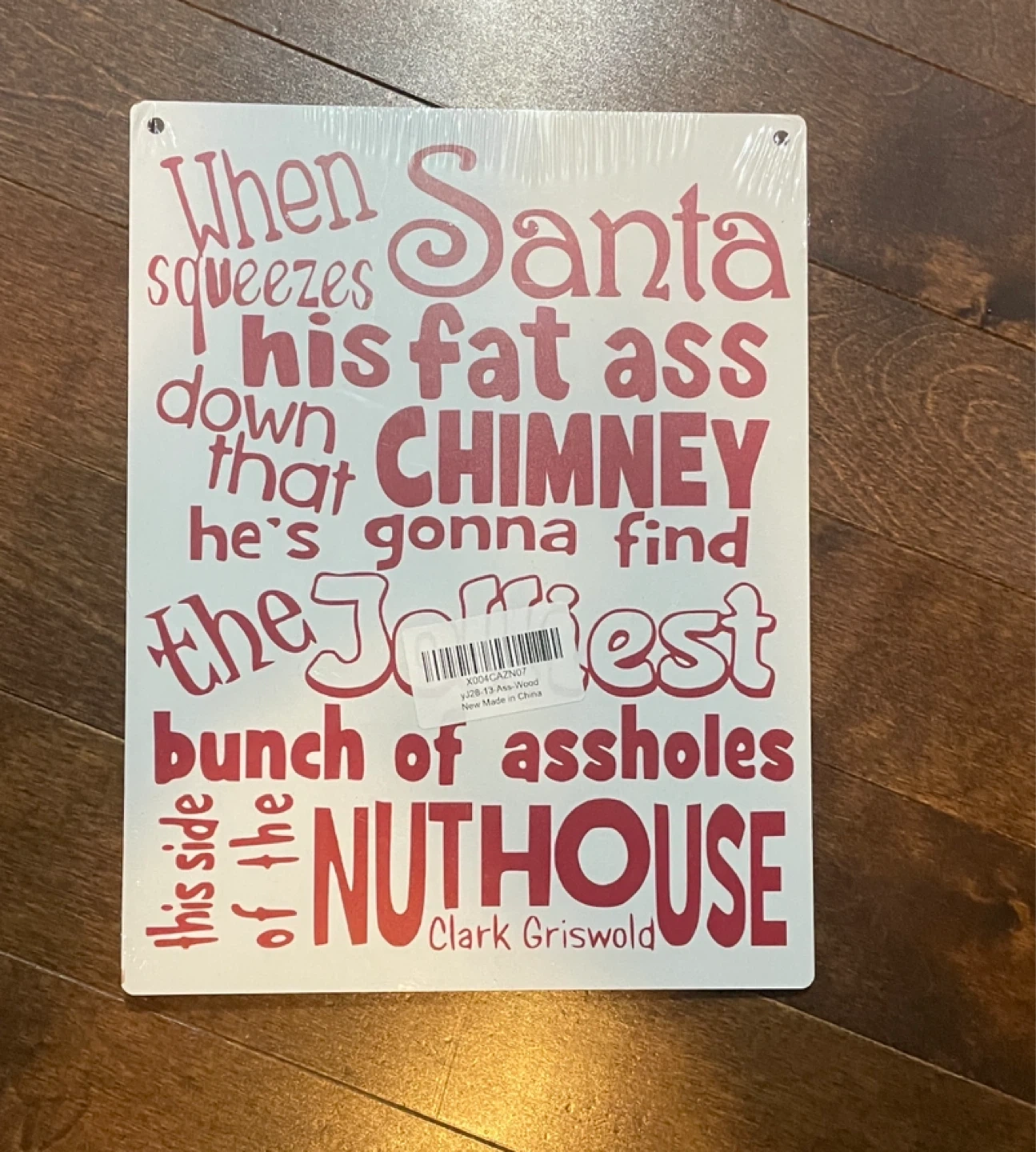 This hilarious Christmas sign is sure to bring some laughs to your holiday decor! The sign says "When Santa squeezes his fat ass down that chimney he's gonna find the jolliest bunch of assholes this side of the nuthouse - Clark Griswold". It's brand new and still in its original packaging