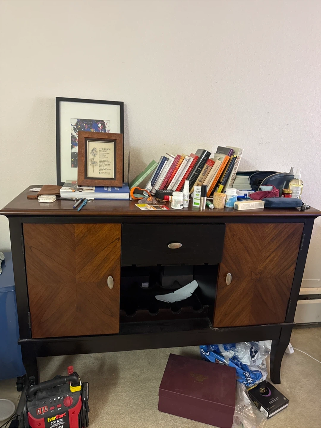 Selling a wooden cabinet with storage. It features two doors with a unique chevron pattern and a drawer in the middle. There's also a wine rack section inside for storing bottles. A stylish and functional piece for any home!