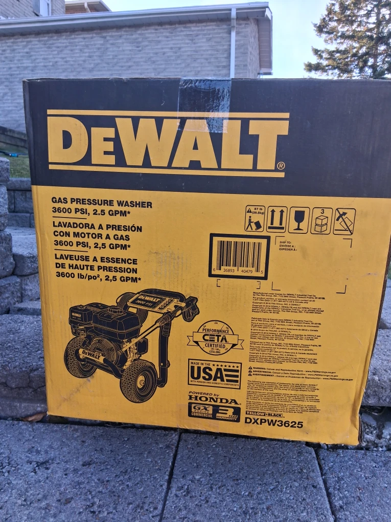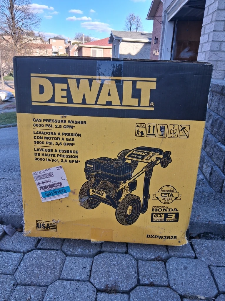 Selling a brand new DeWalt gas pressure washer, still in its original box! This powerful machine delivers 3600 PSI at 2.5 GPM, perfect for tough cleaning jobs. It's powered by a Honda GX engine for reliable performance. Model number is DXPW3625