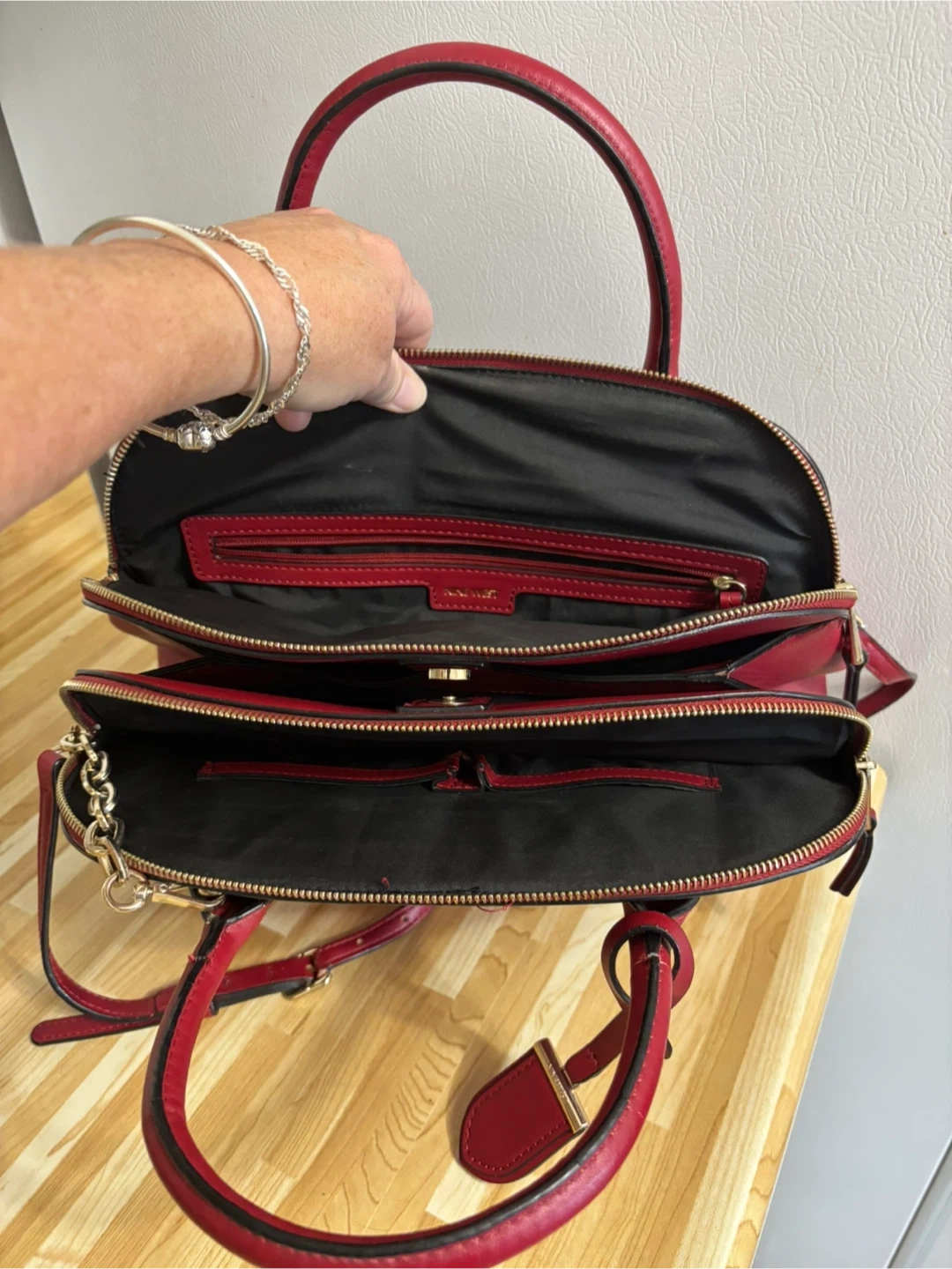 It has a structured design with gold-tone hardware and a detachable shoulder strap.