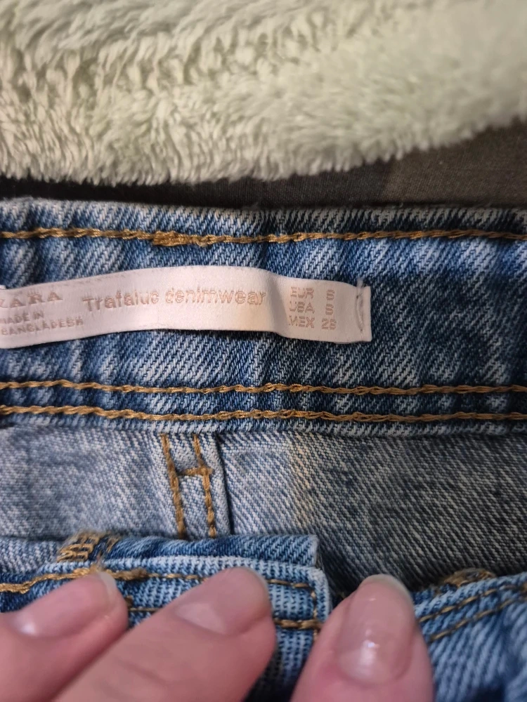 Here's a Zara Trafaluc denim skirt in size small! It's a cute, distressed style with a frayed hem and some rips for a trendy look. Perfect for casual outings or dressing up with a cute top!