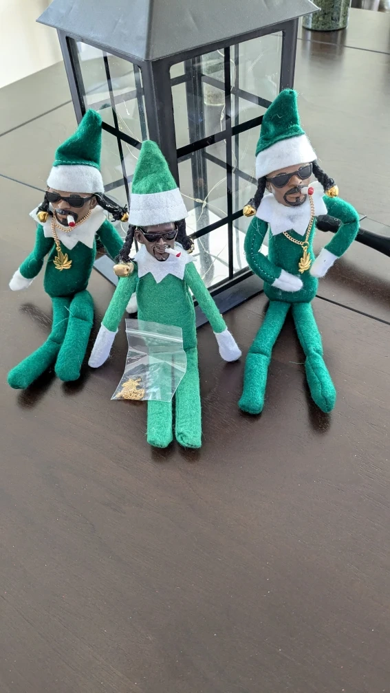 Selling three Snoop Dogg inspired Elf on the Shelf dolls. Each elf is decked out with sunglasses, a gold chain, and a cigarette.