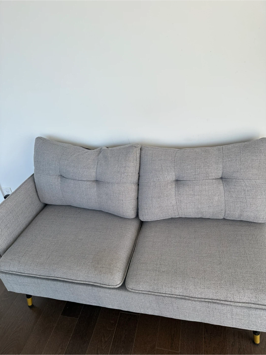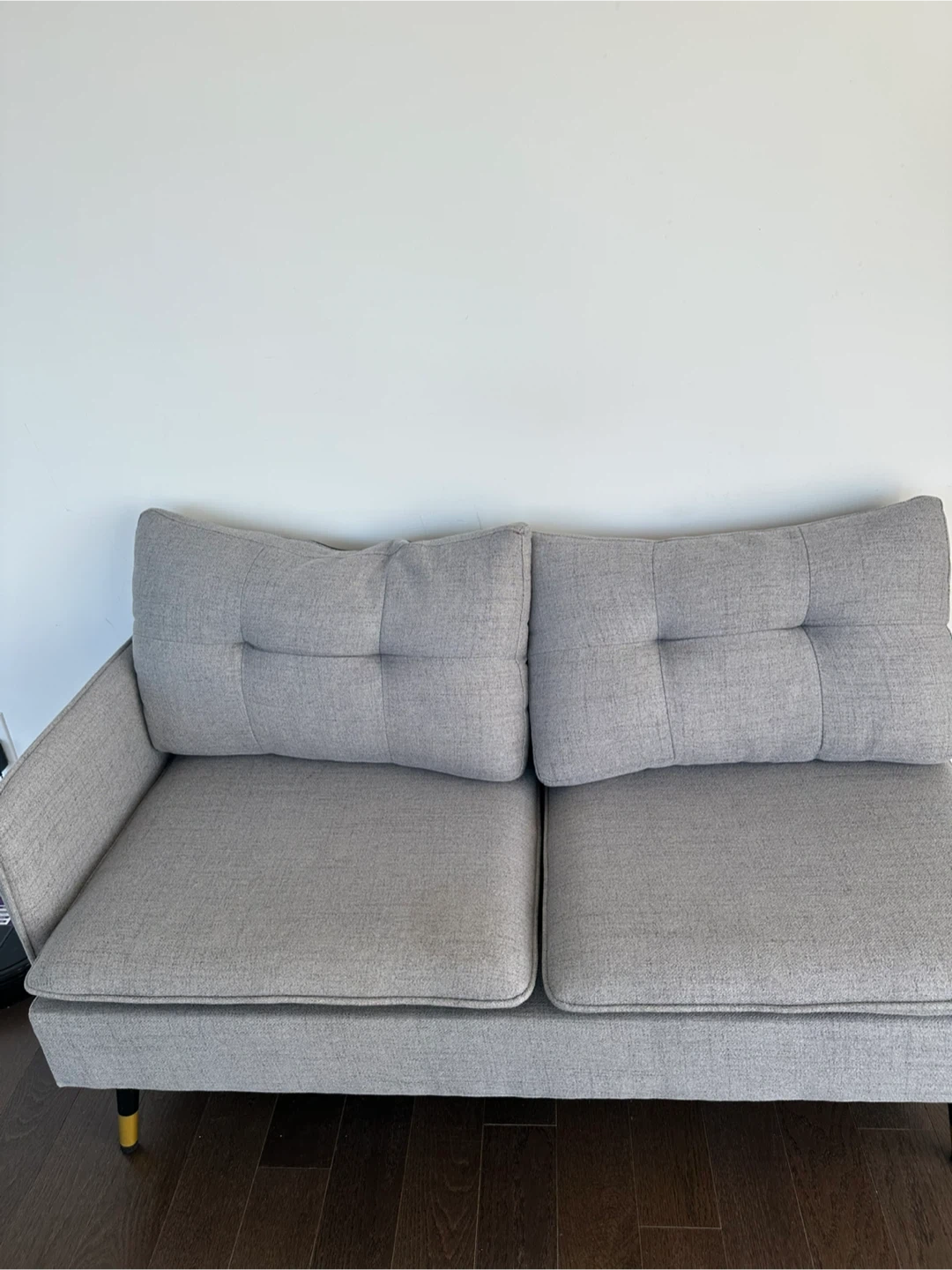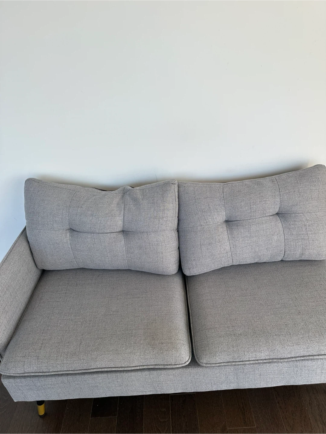 Selling a comfy two-seater sofa! It's in great condition and would be perfect for a smaller space or apartment. The light grey colour is neutral and will fit in with any decor. There are some minor signs of use. Only one stain which we can remove!