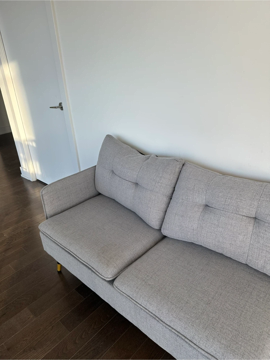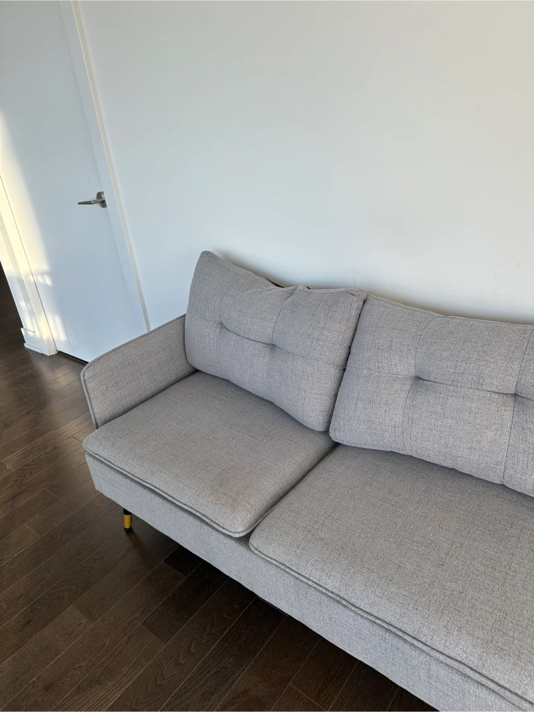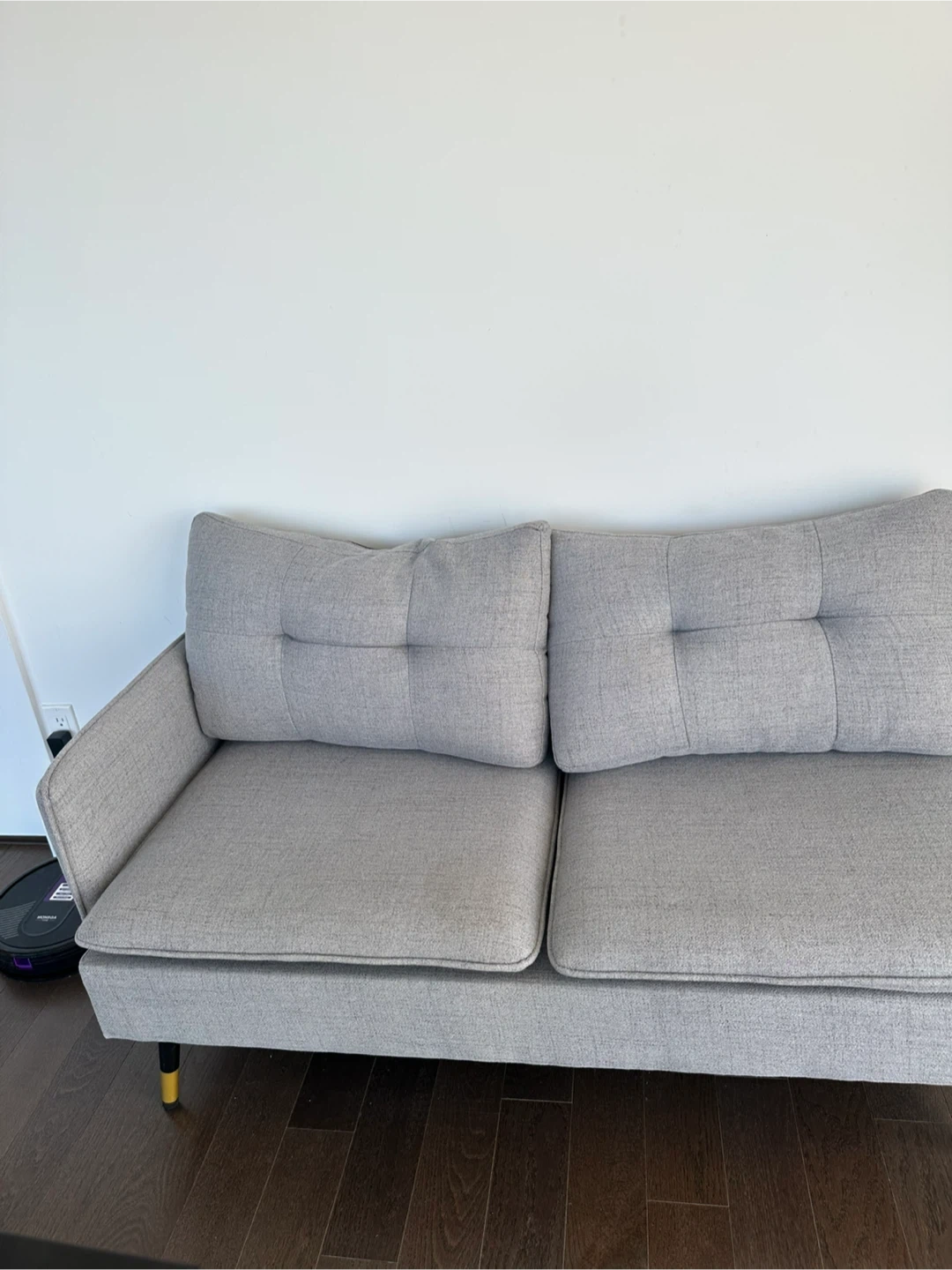 Selling a comfy two-seater sofa! It's in great condition and would be perfect for a smaller space or apartment. The light grey colour is neutral and will fit in with any decor. There are some minor signs of use. Only one stain which we can remove!