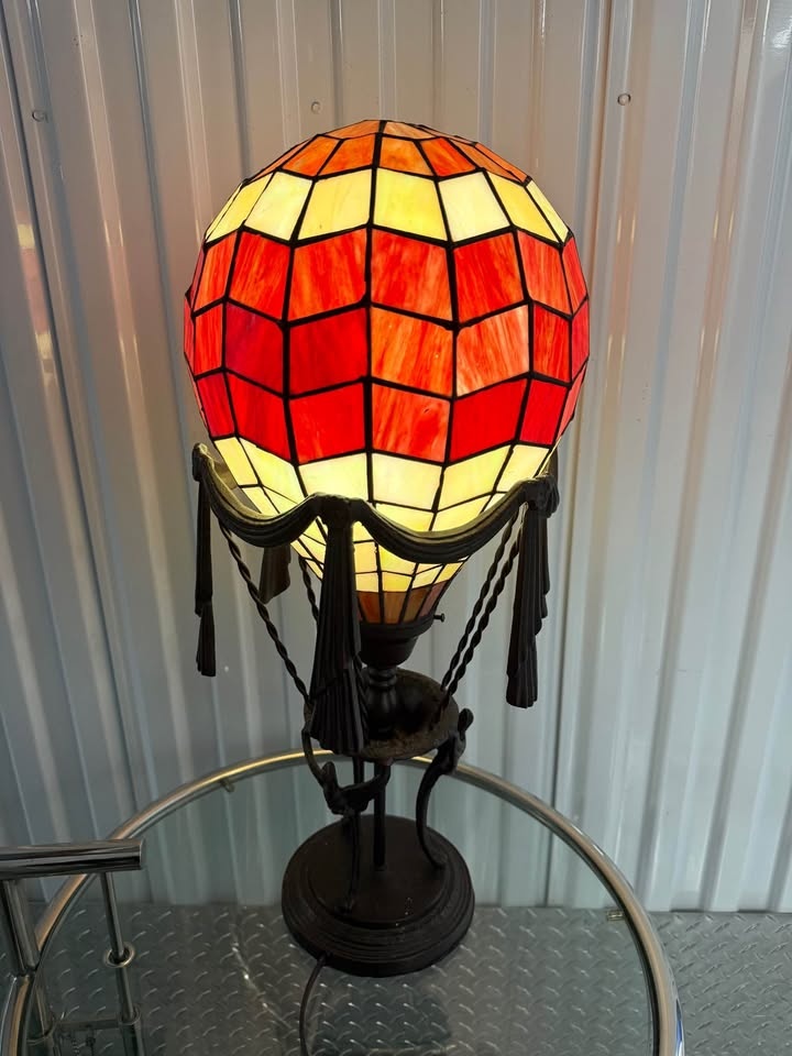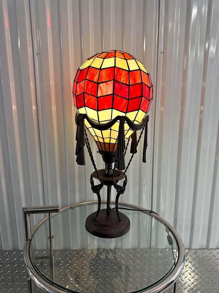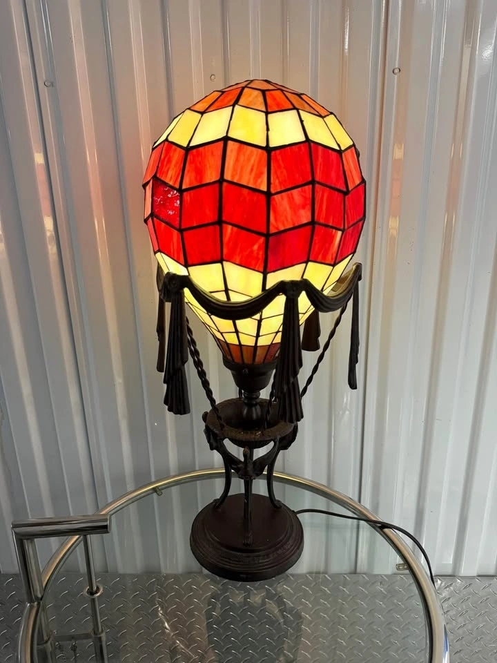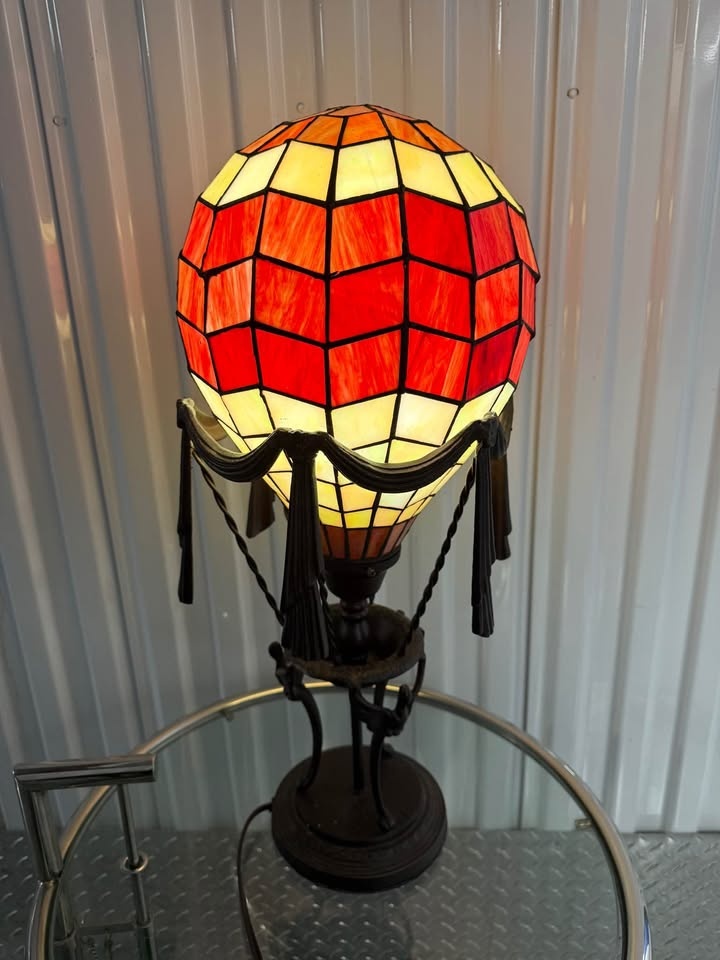 Tiffany style stained glass hot air balloon lamp. The shade features hand crafted multicolor stained glass panels that glow beautifully when lit.