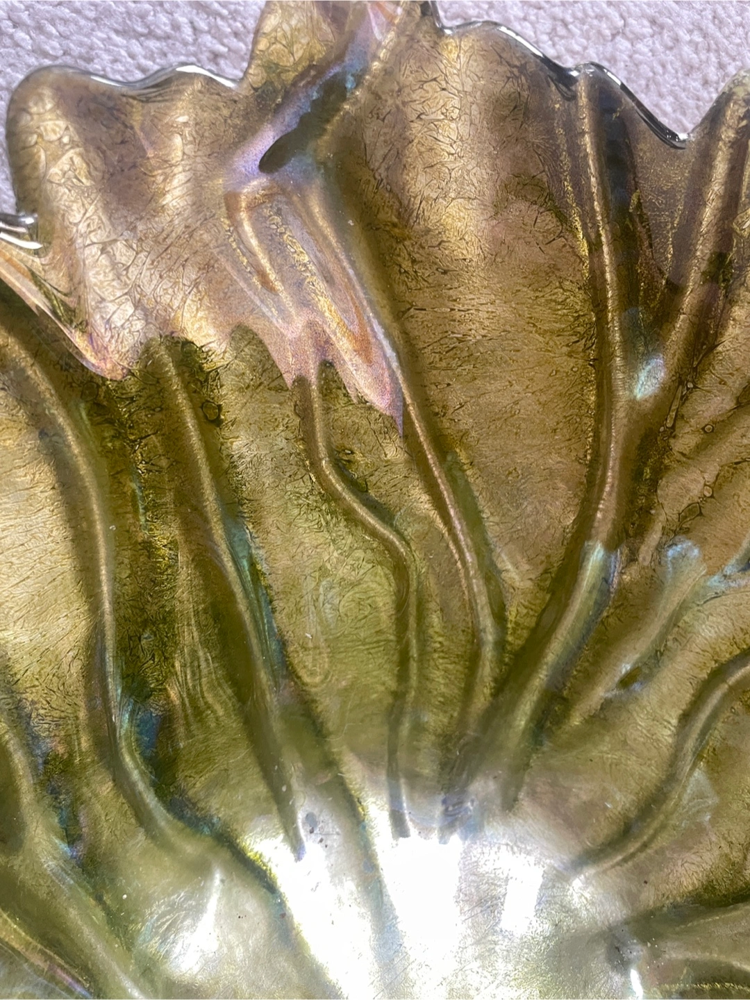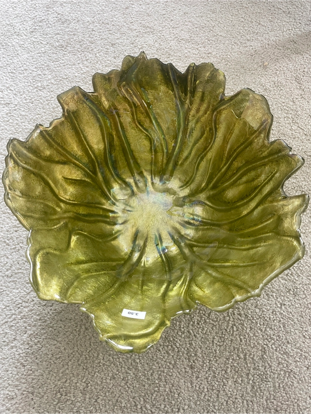 Beautiful decorative glass bowl with a unique leaf-like design in a vibrant golden colour. It's perfect for adding a touch of elegance to any room. There are some minor signs of wear, but it's still in great shape and ready to be enjoyed!