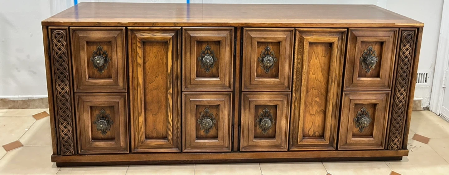 76Stop scrolling! This stunning vintage 1970s credenza is the statement piece your room is missing. Forget flimsy modern furniture—this piece is solid wood, heavy, and built to last. This classic Spanish Revival style features incredible braided/rope relief carvings on the sides and original, ornate metal hardware. It has a beautiful, rich wood tone that anchors any room. The Perfect Low Profile: The 27" height is absolutely perfect for use as a modern media console, large TV stand, or an entryway centerpiece. Tons of closed storage to hide cables, blankets, or linens. Style: Vintage 1970s (Style of Bassett, Broyhill, Singer) Condition: Excellent vintage condition. Ready for a new home! Length: 64 inches Depth: 18 inches Height: 27 inches