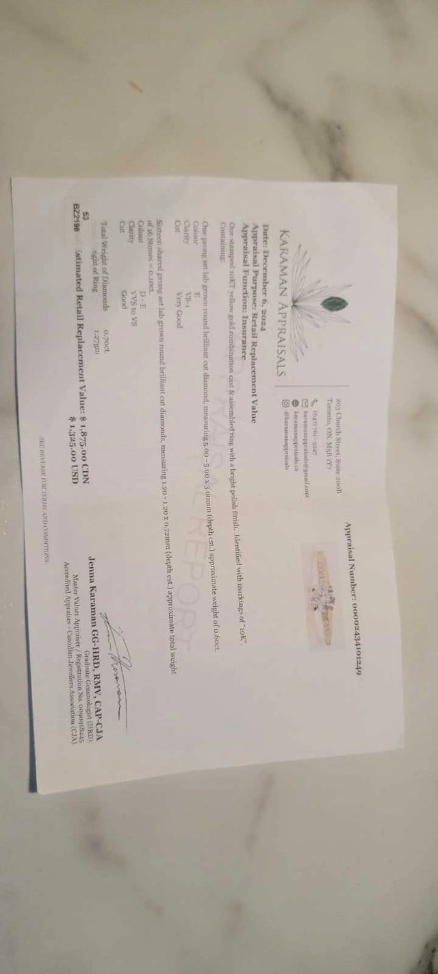 This ring is made in Canada and is brand new. All the details are in the appraisal certificate in the photos. I do have other rings available if you're interested.