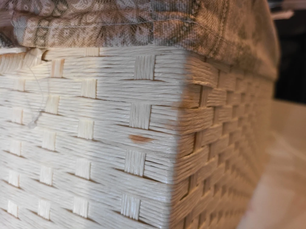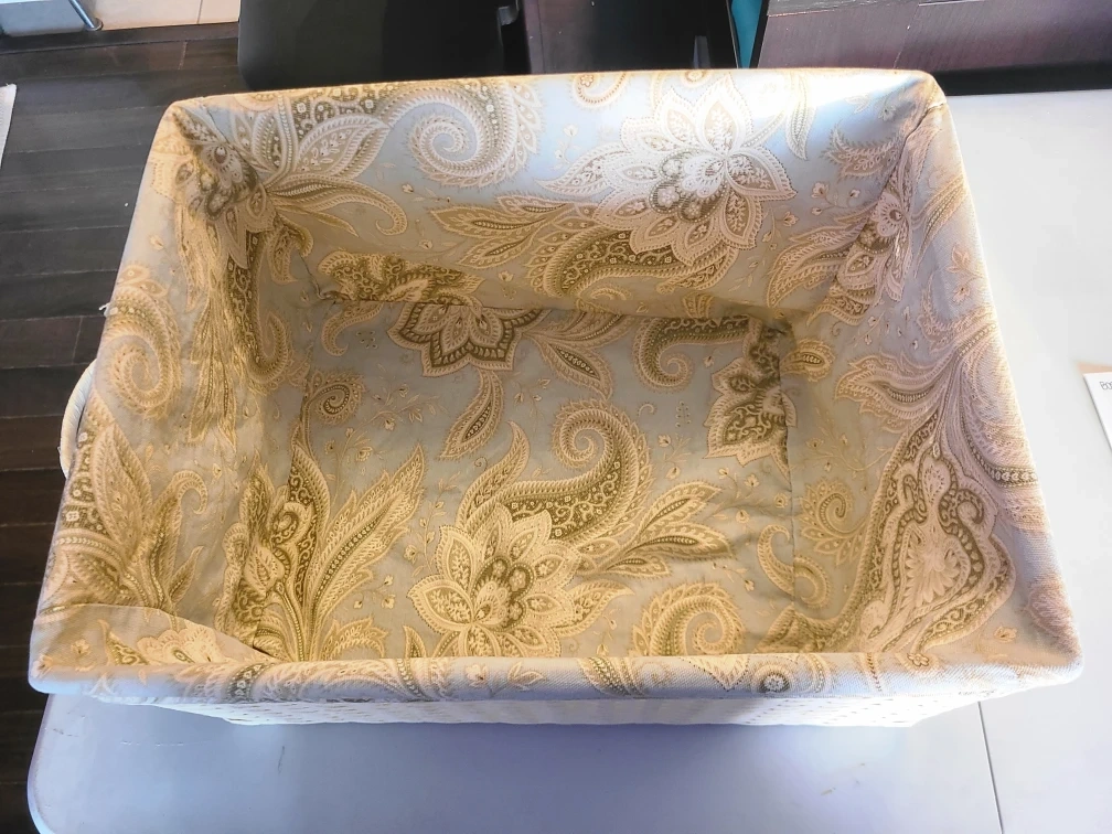 Here's a wicker storage basket that's perfect for organizing your things! It comes with a pretty fabric liner, adding a touch of style to your storage solution. There's a small stain on the wicker but otherwise it's in great shape!