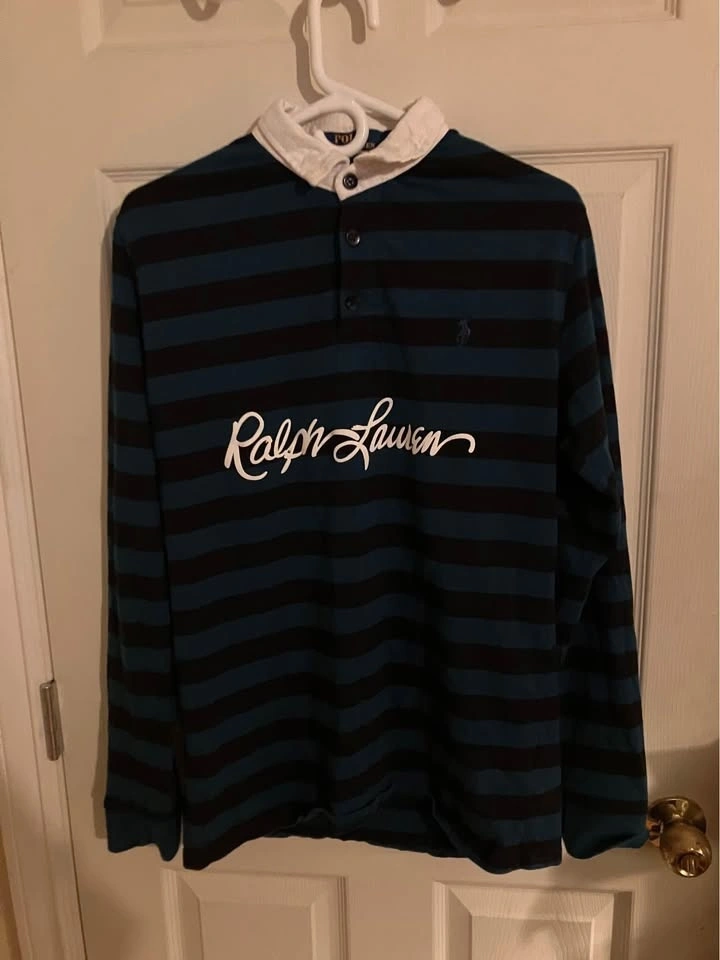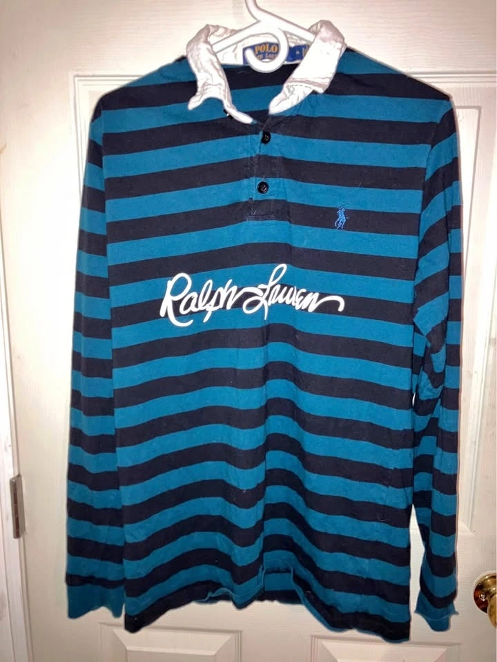 This Ralph Lauren long sleeve polo shirt is in gorgeous condition with a really fashionable dark cyan/blue colour. There's a large “Ralph Lauren” Logo emblazoned on the chest in script. Kept in storage and worn maybe a handful of times. The printed logo has no tear and there’s no pilling or holes of any kind.