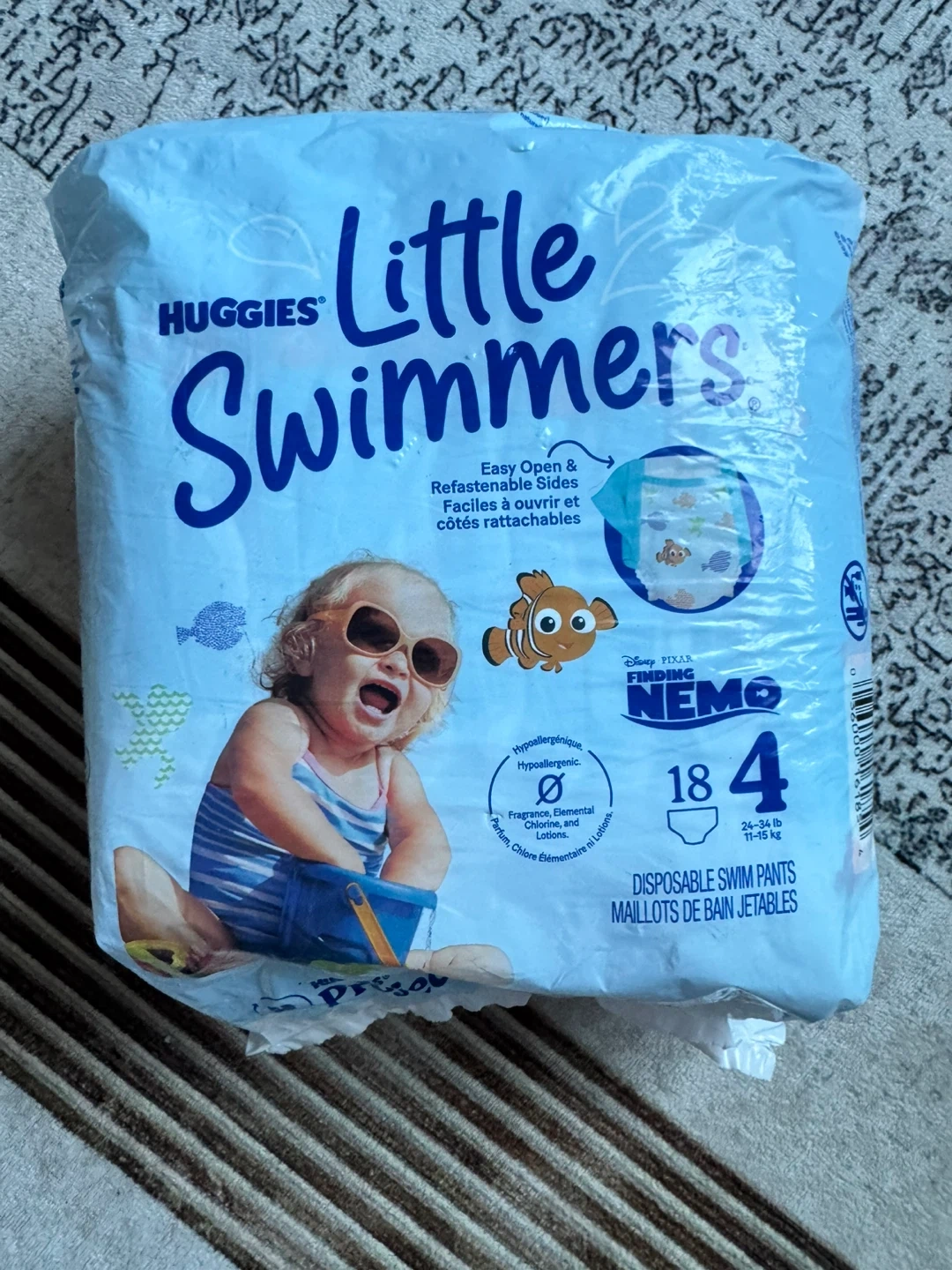 I'm selling a pack of Huggies Little Swimmers disposable swim pants! They're size 4, perfect for babies weighing 24-34 lb (11-15 kg). These swim pants feature easy open and refastenable sides, and are fragrance and chlorine free!