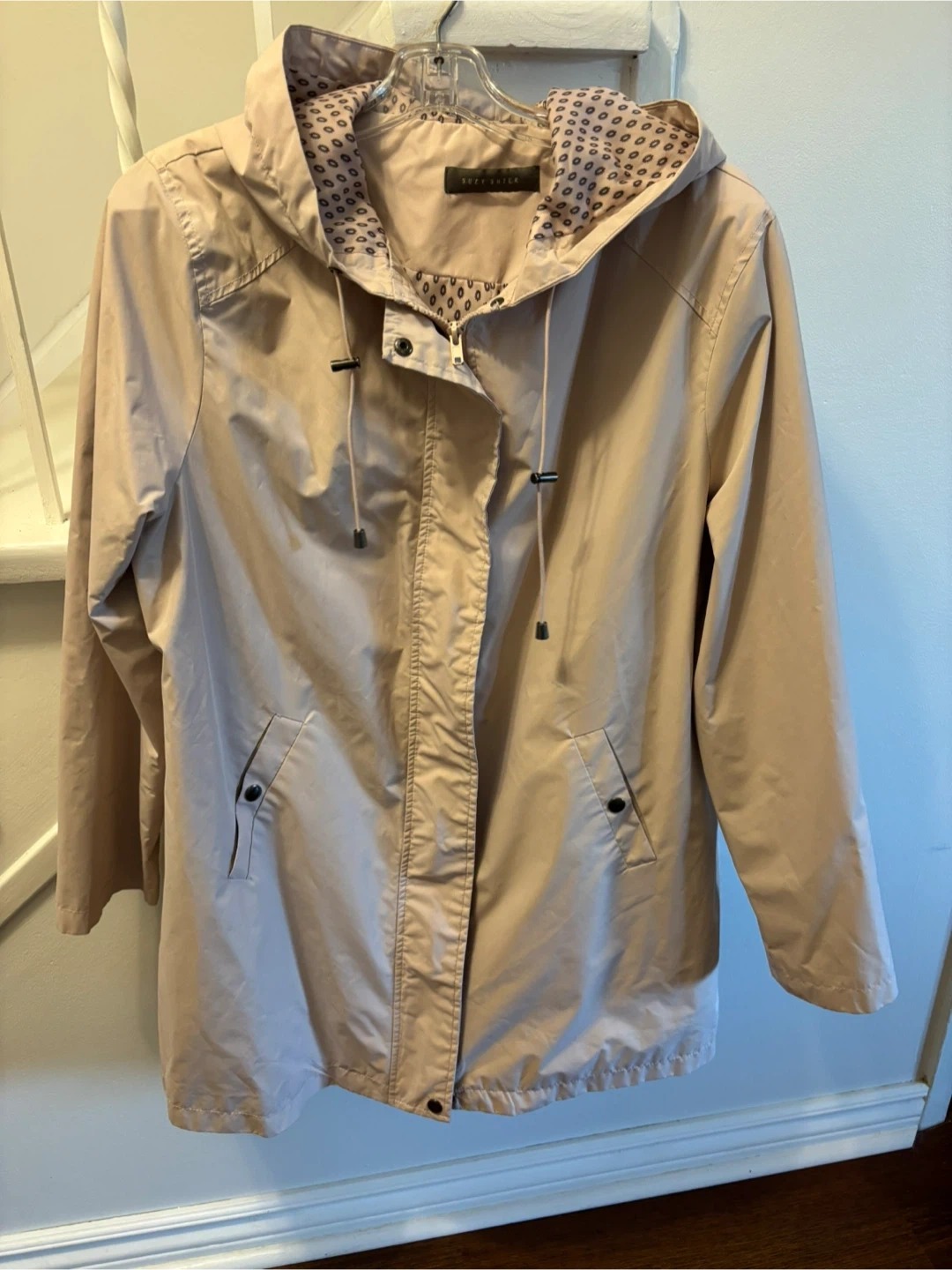 Selling a Suzy Sheir rain jacket in a lovely dusty rose/pale pink colour with grey/black polka dot lining.