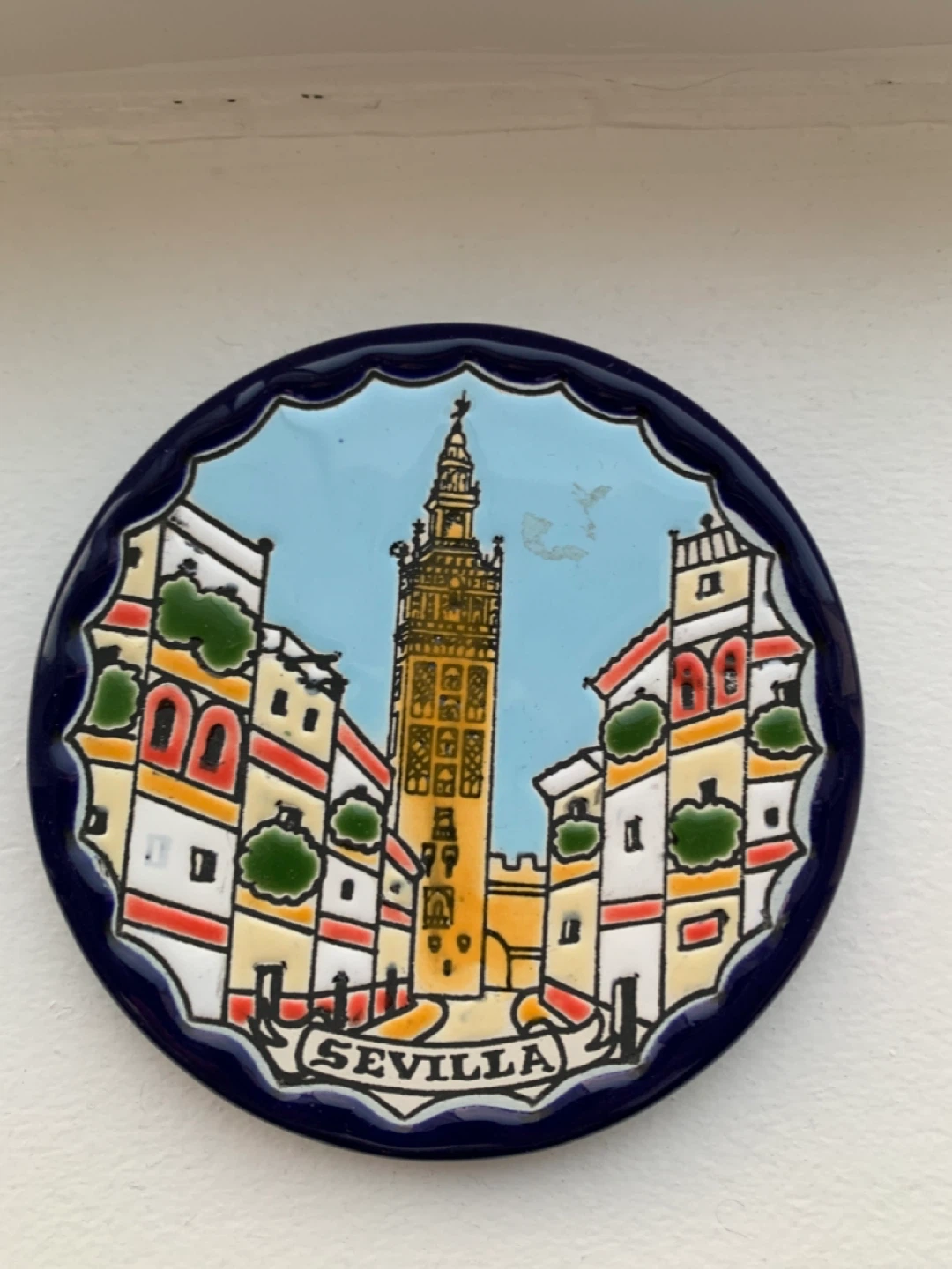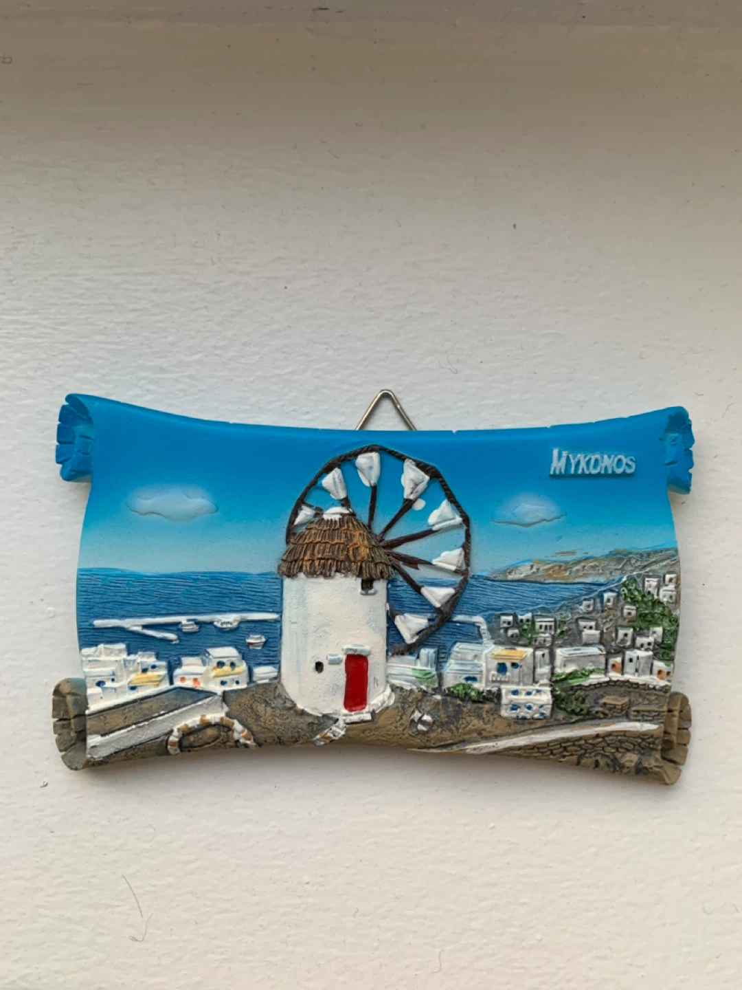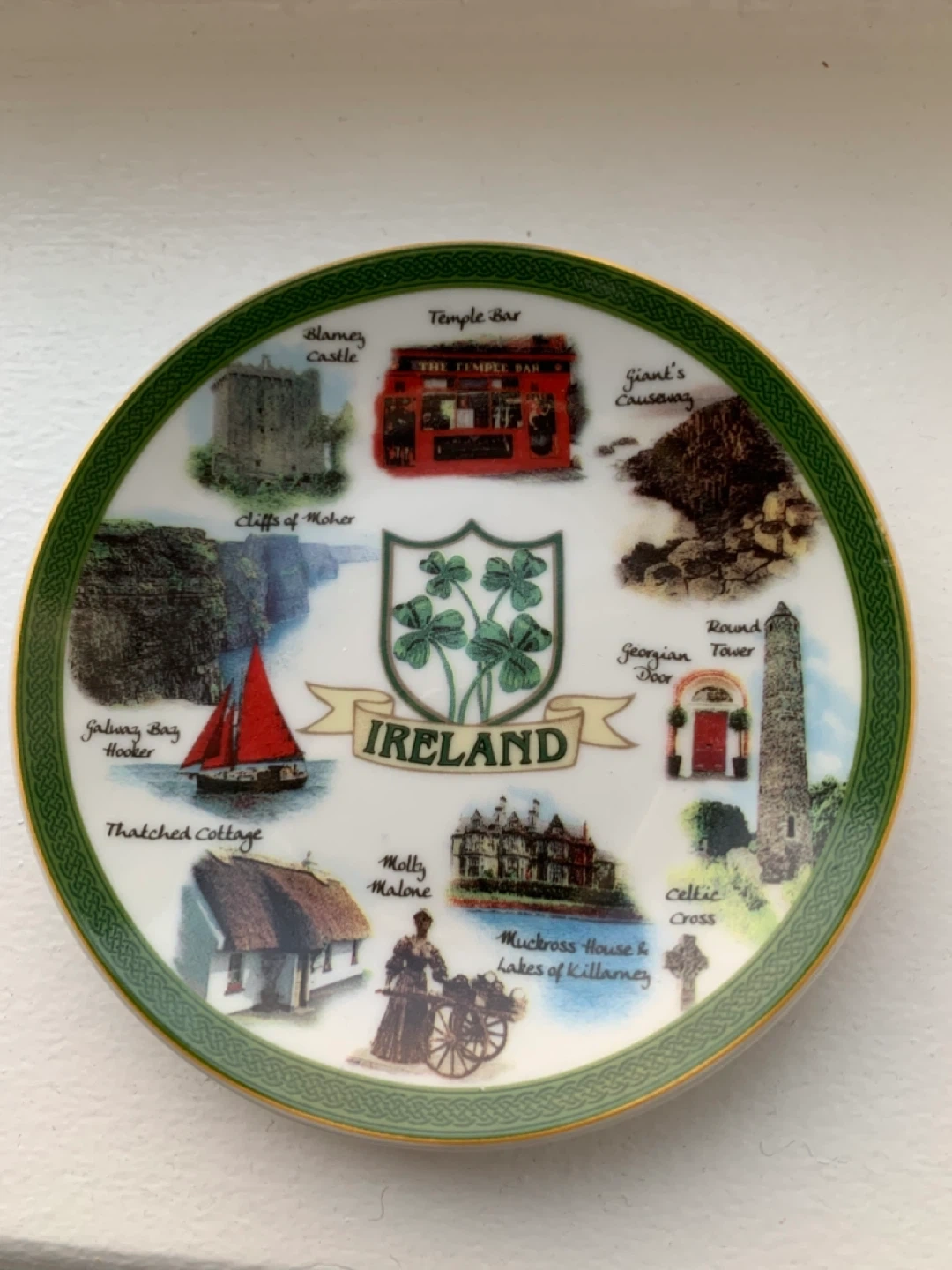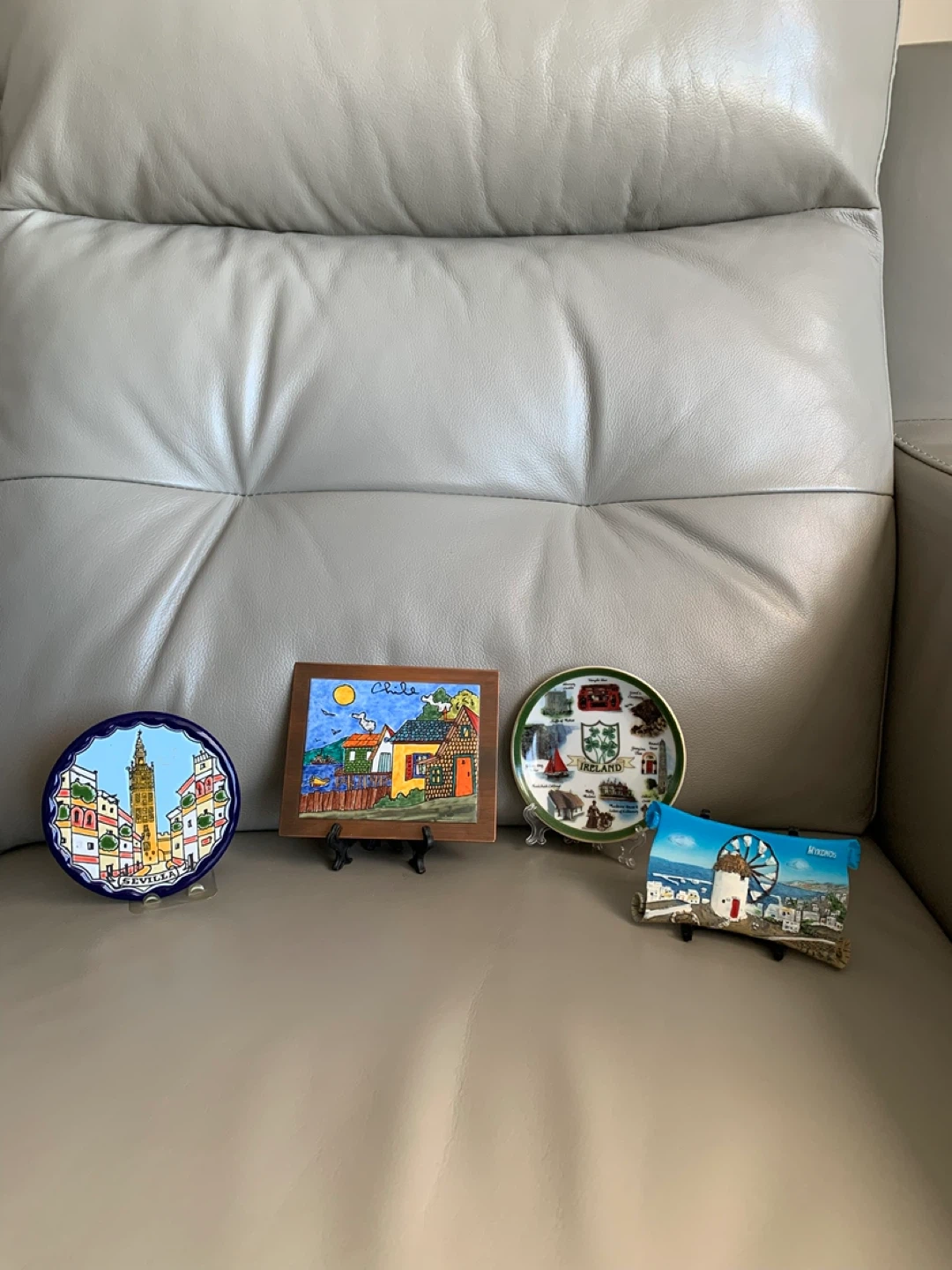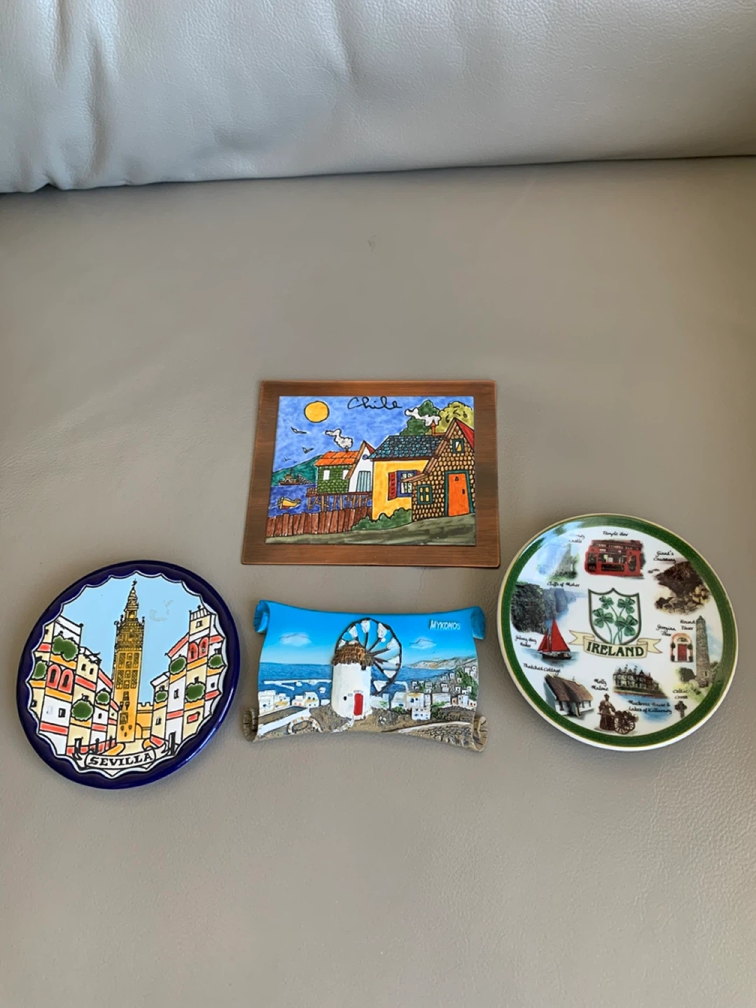 1). A Plate from Seville, 4” in Diameter 2). A Plaque from Mykonos, Greece, 4” L X 3” W 3). A Plate from Ireland, 4” in Diameter and 4). A Country Side Landscape Plaque from Chile, S. America, 4”L C 4” W