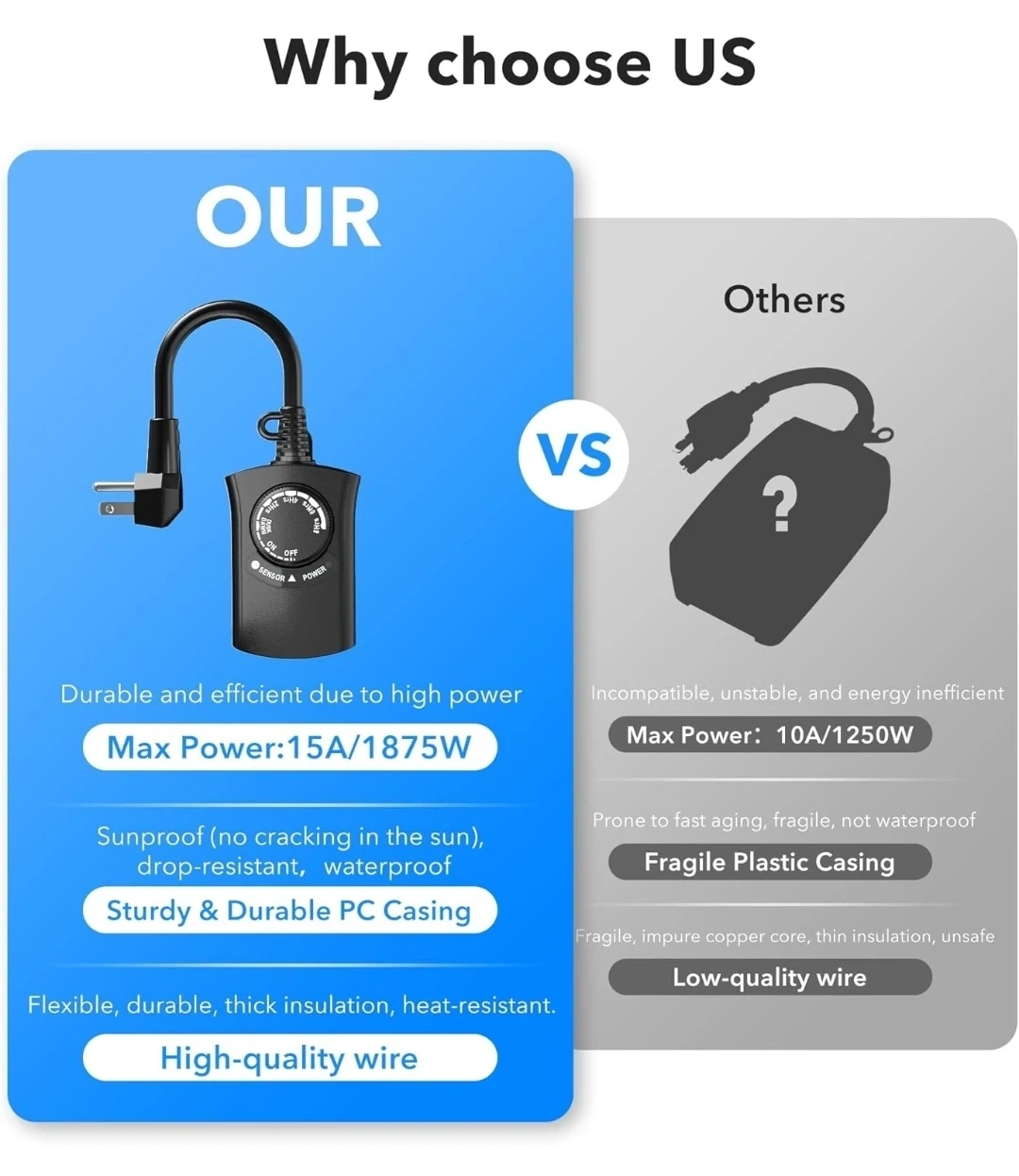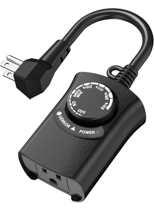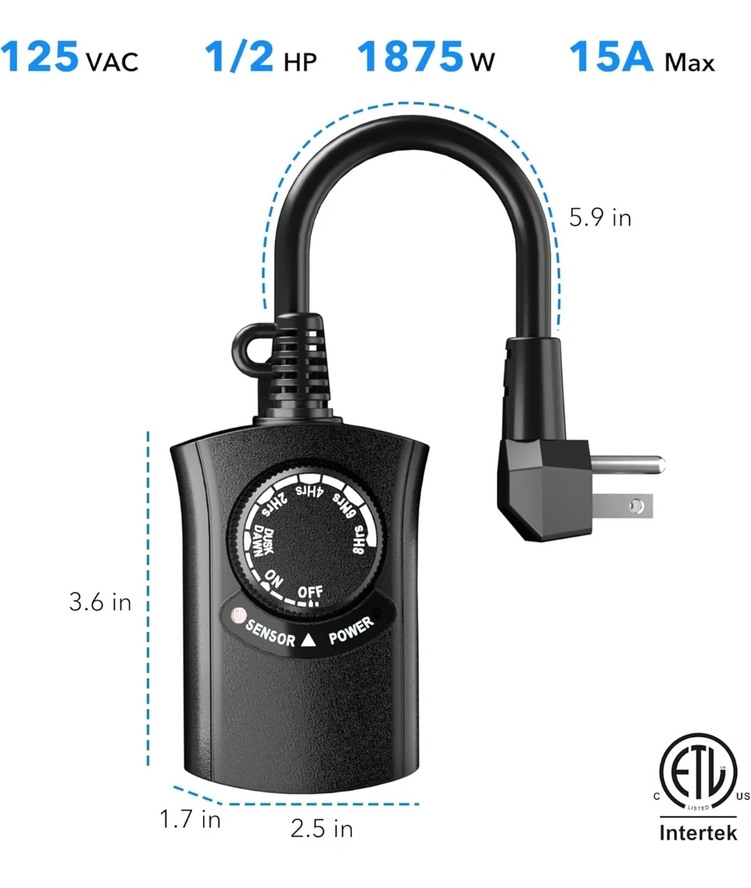 Selling brand new HBN outdoor light timer! It's waterproof and features a photocell dusk to dawn light sensor. You can set it for 2/4/6/8 hour countdowns. It has one grounded outlet and can handle up to 1875W 15A 1/2HP. Perfect for Christmas lights
