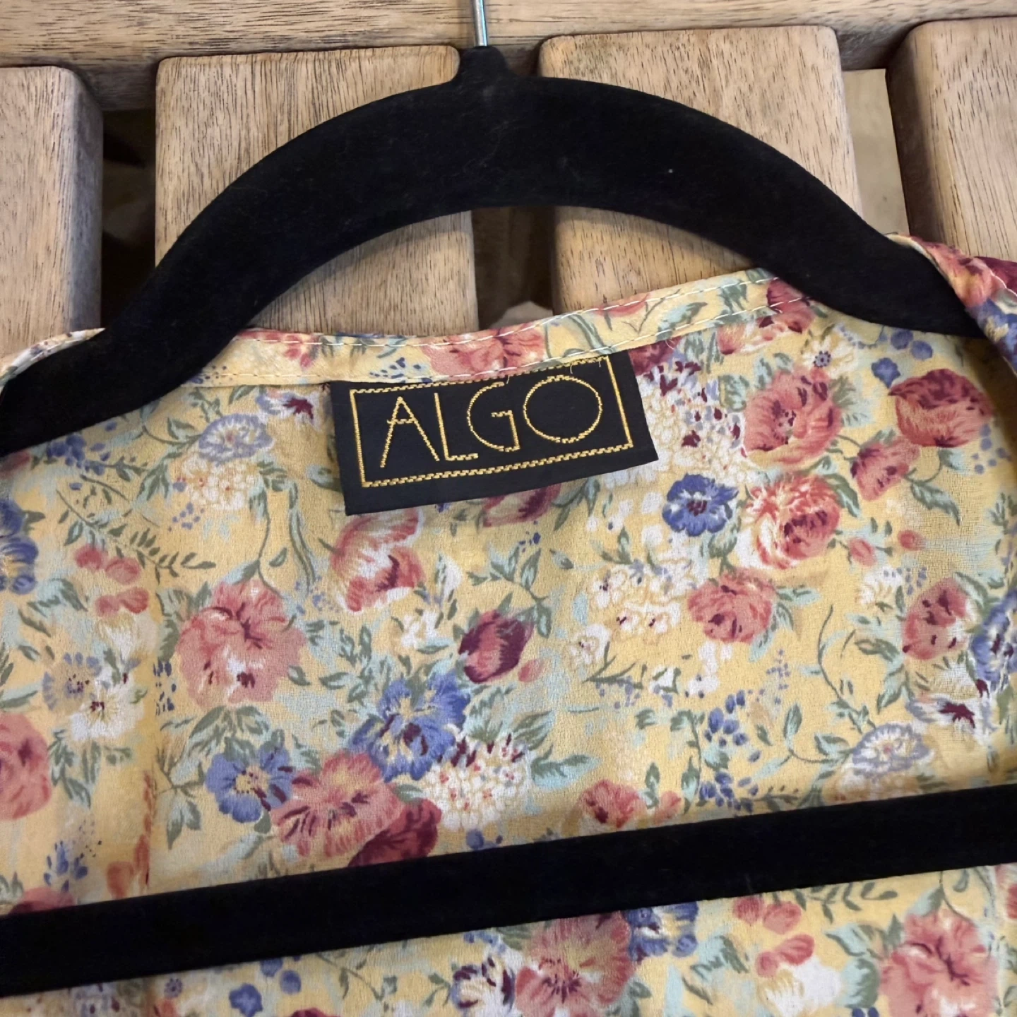 Algo pretty long yellow dress with pink and blue flower print, pearly buttons, and corset lacing up the back.