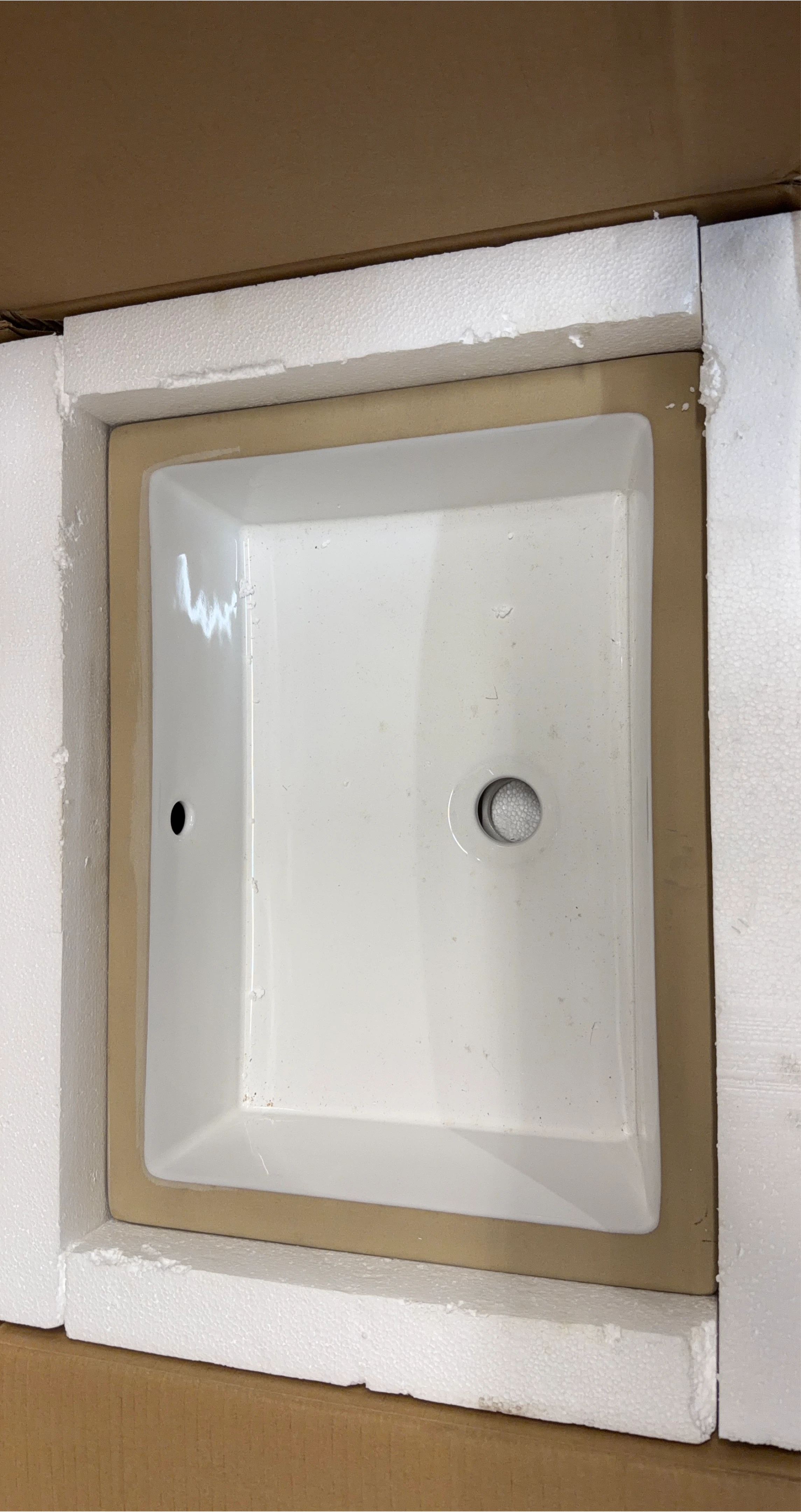 I'm selling a brand new, white undermount bathroom sink still in its original packaging! It's in perfect condition and ready to be installed in your bathroom. It has a rectangular shape and a clean, modern look. Feel free to reach out if you're interested!