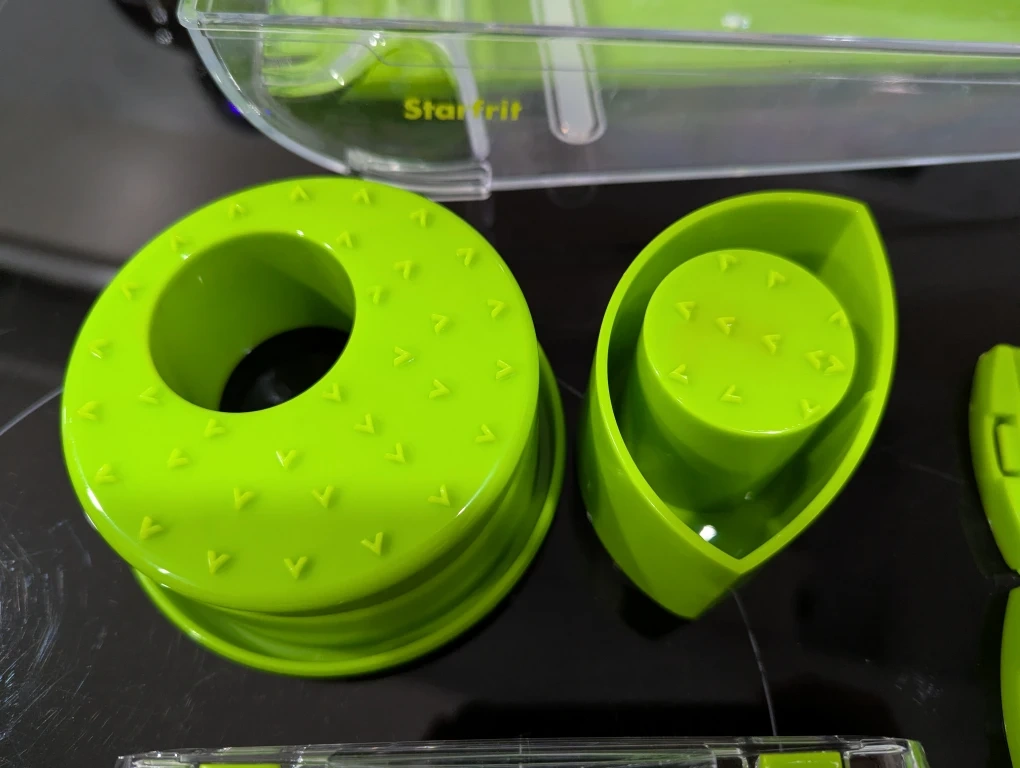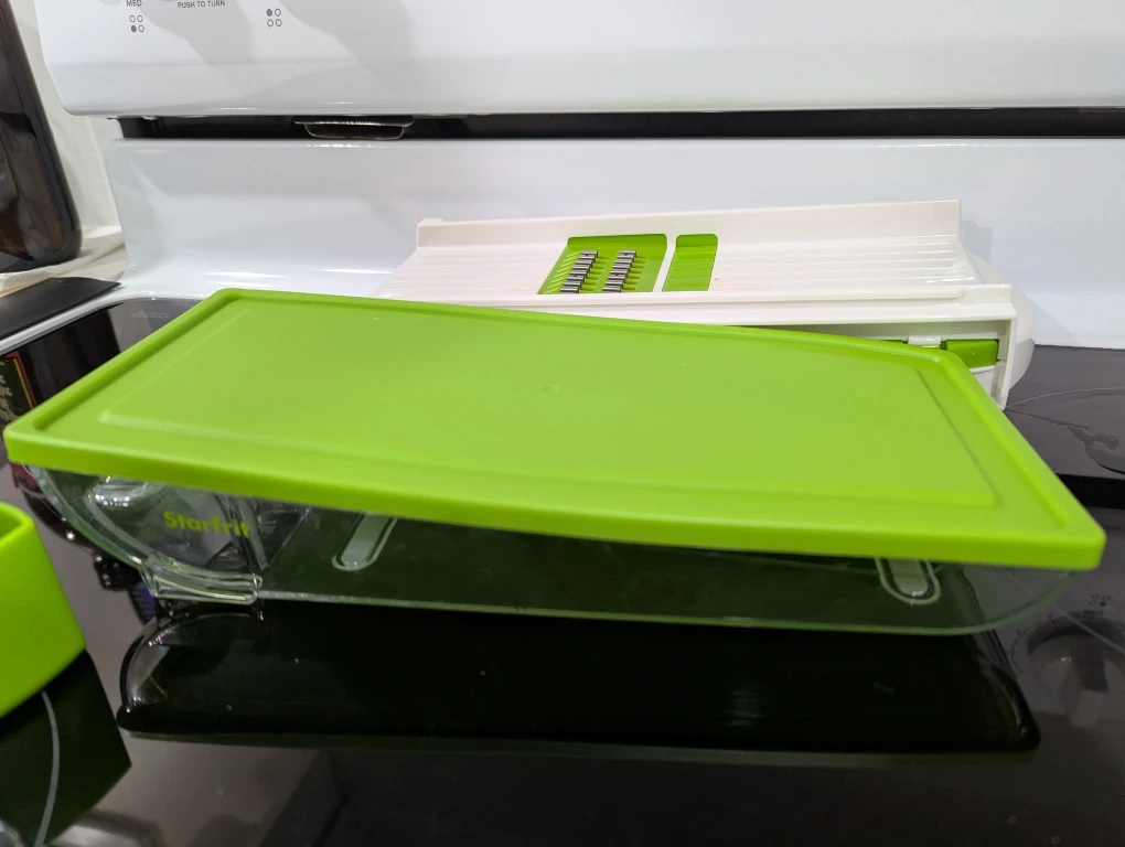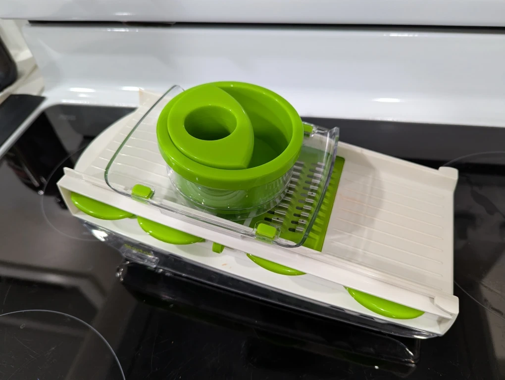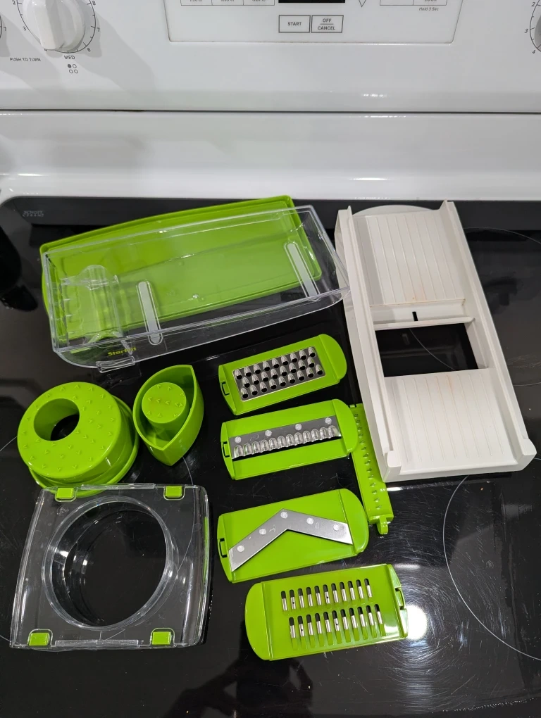 Comes with five blades: crinkling, slicing, julienning, grating, and shredding. And a knbbed safety guide.